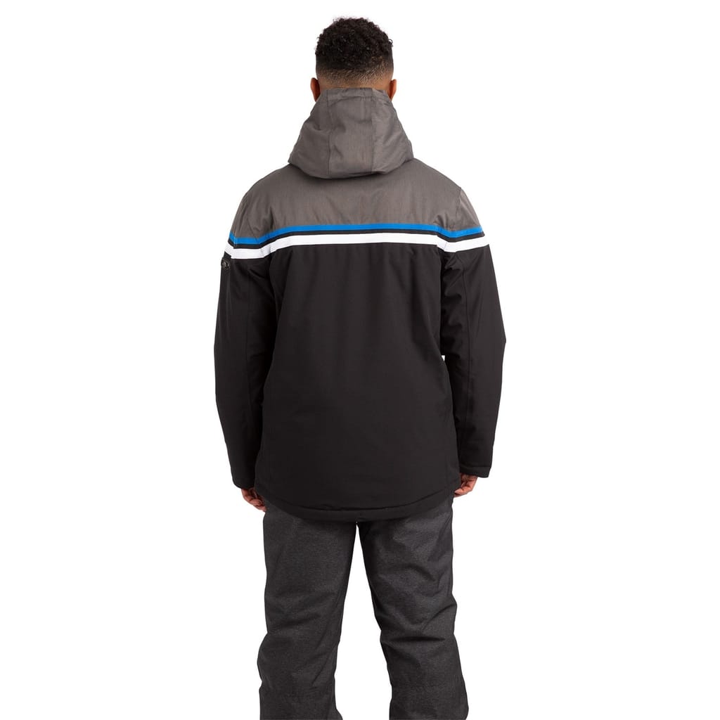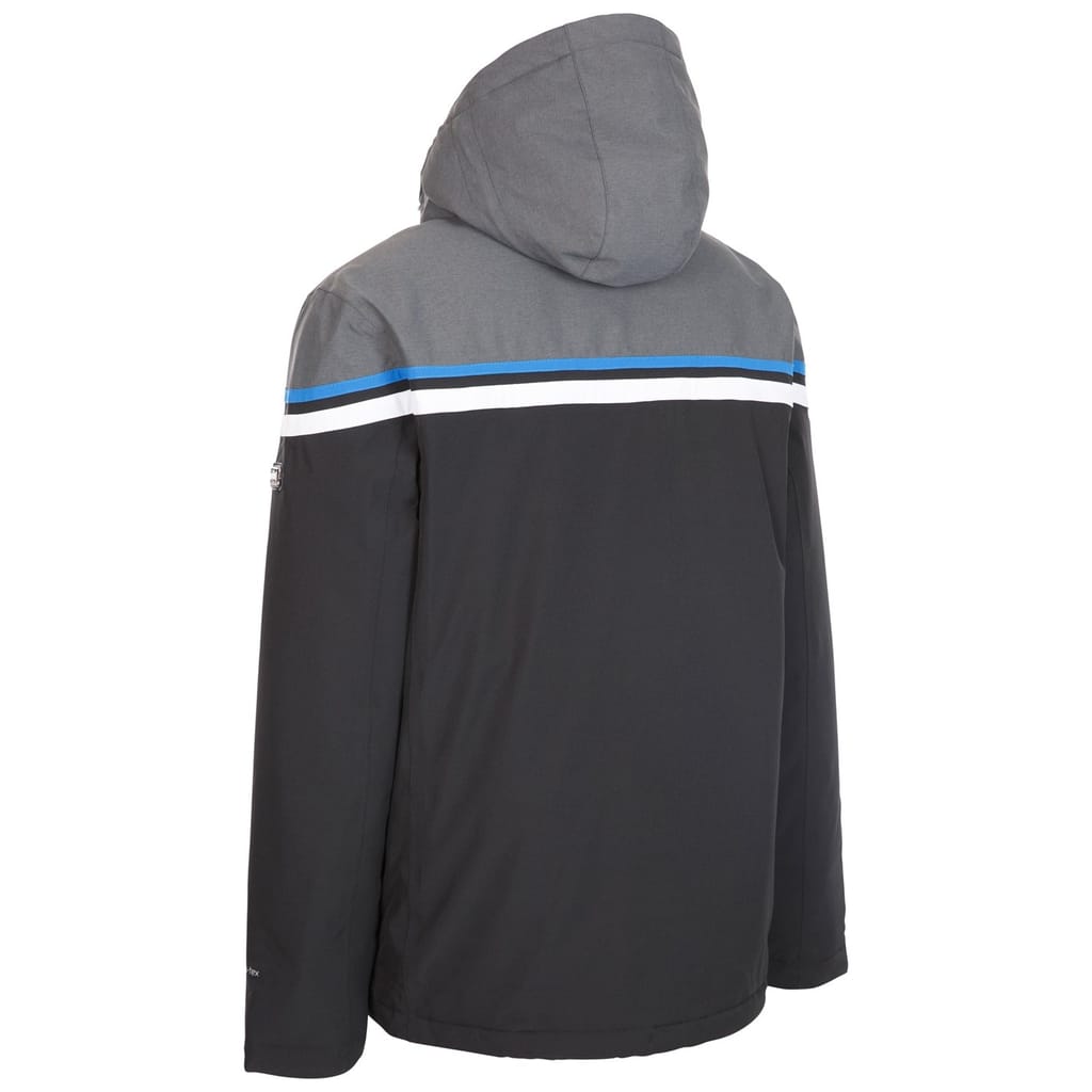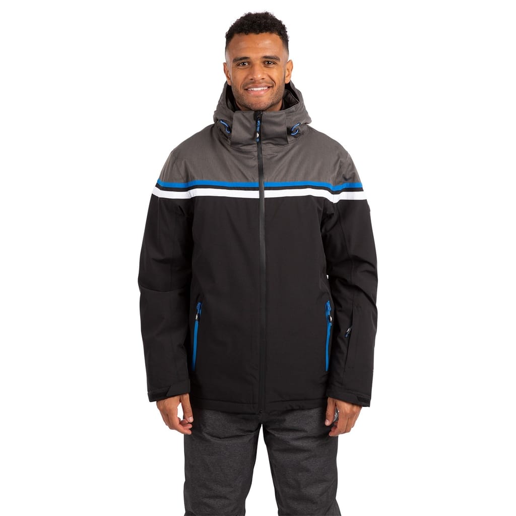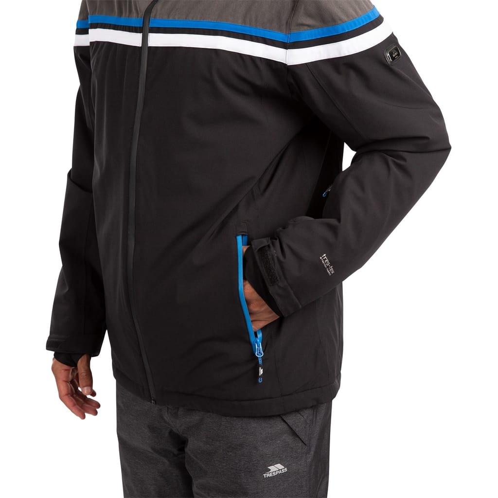 This Trespass ski jacket features a hooded design and a regular fit, perfect for winter adventures. The jacket showcases a colour block pattern and includes practical pockets. It is equipped with a zipper closure and elasticated cuffs, ensuring comfort and functionality. The straight hem adds a neat finish to this essential winter piece. -
