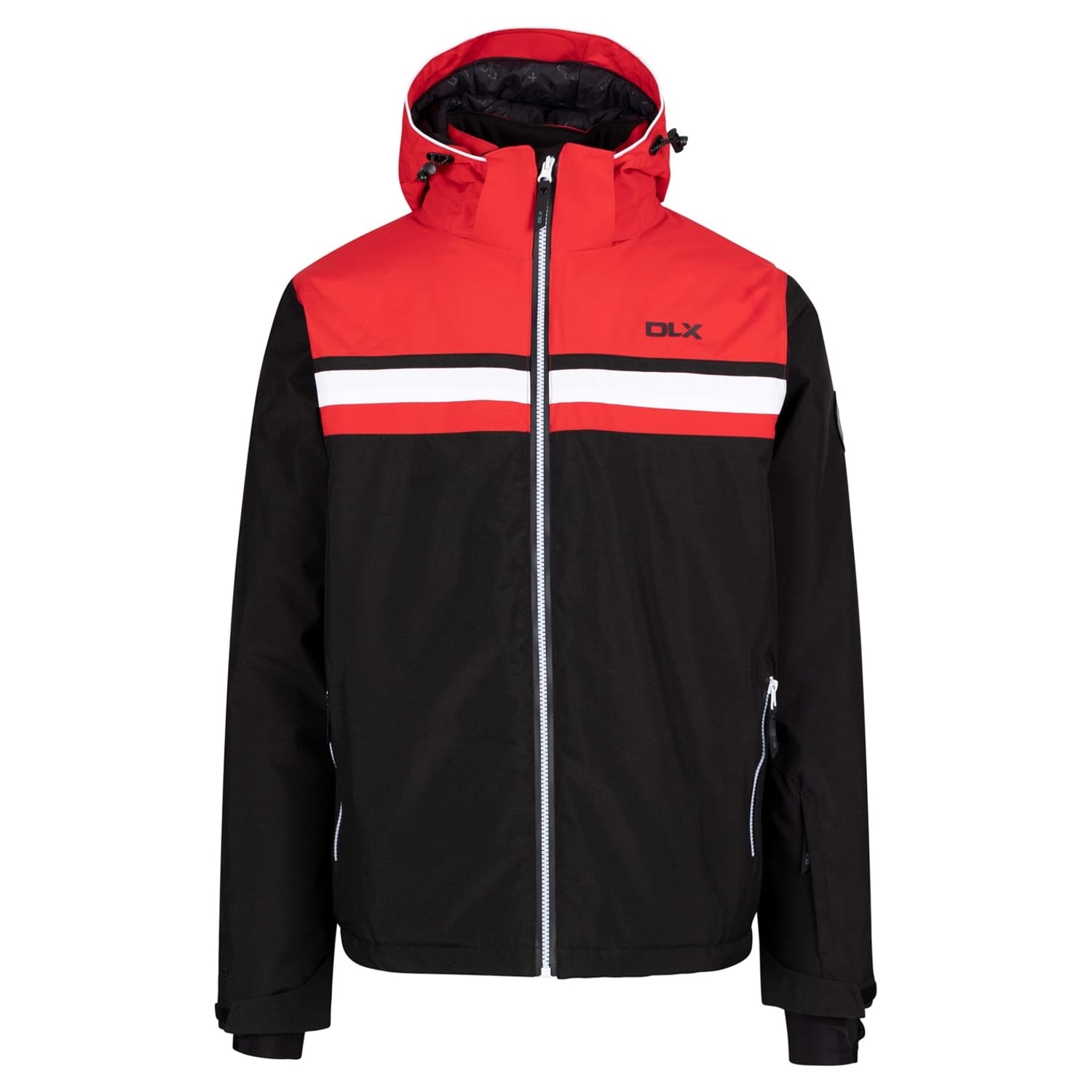 DLX ski jacket features a hooded design with a zipper closure, offering a regular fit. The jacket showcases a colour block pattern and includes a chest pocket with a logo embellishment. It is designed with a straight hem and ribbed cuffs, making it a practical choice for ski enthusiasts. -