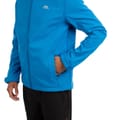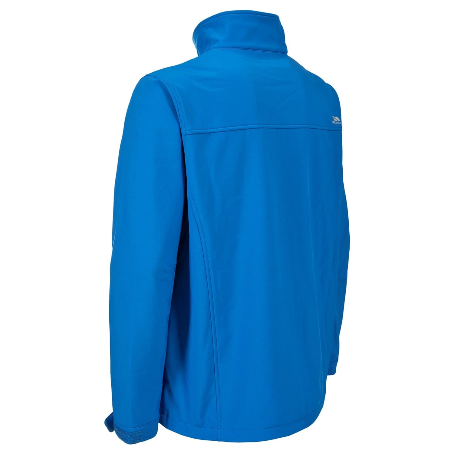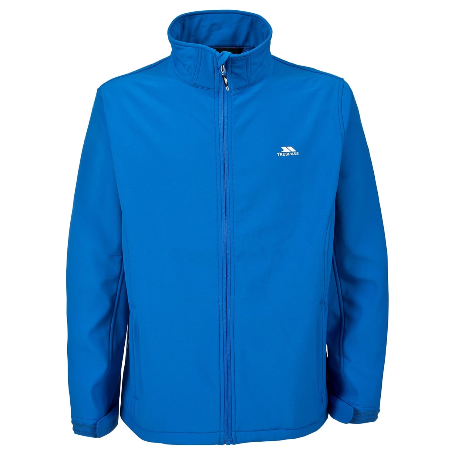 The Trespass softshell jacket features a regular fit with a solid pattern and a straight hem. It includes a zipper closure and ribbed cuffs for added comfort. The jacket is adorned with a logo embellishment, offering a sleek and functional design. -