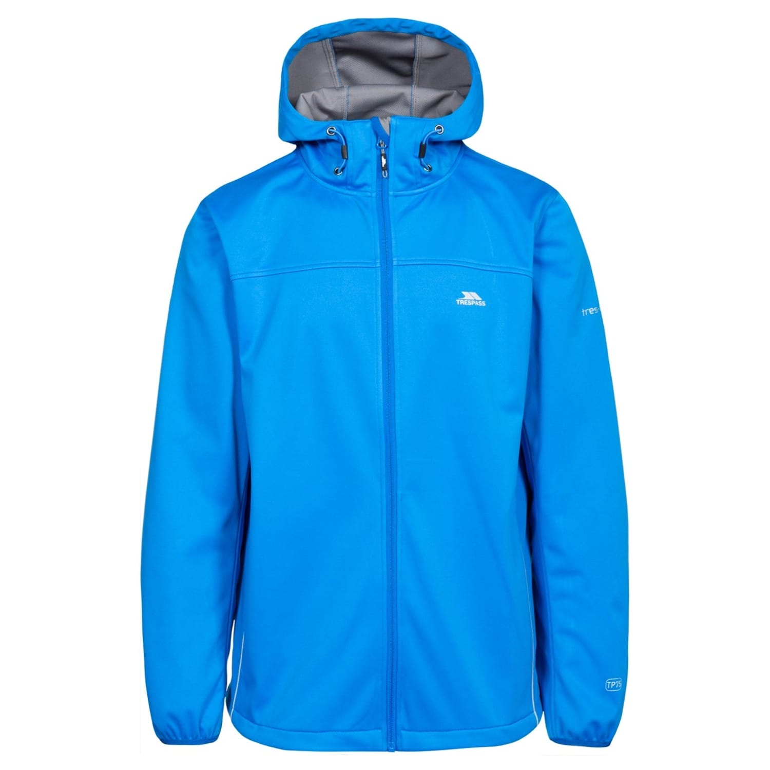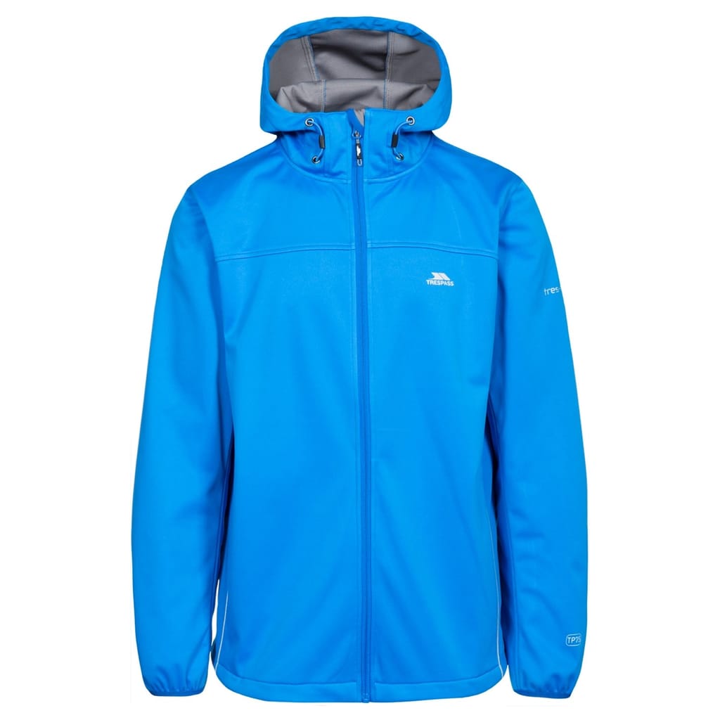 This Trespass softshell jacket features a hooded design with a zipper closure, offering a regular fit. The solid pattern is complemented by an elasticated cuff and a straight hem. A logo embellishment adds a subtle touch to this practical outerwear piece. -