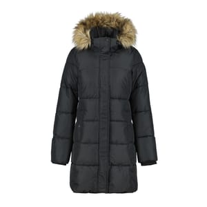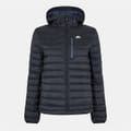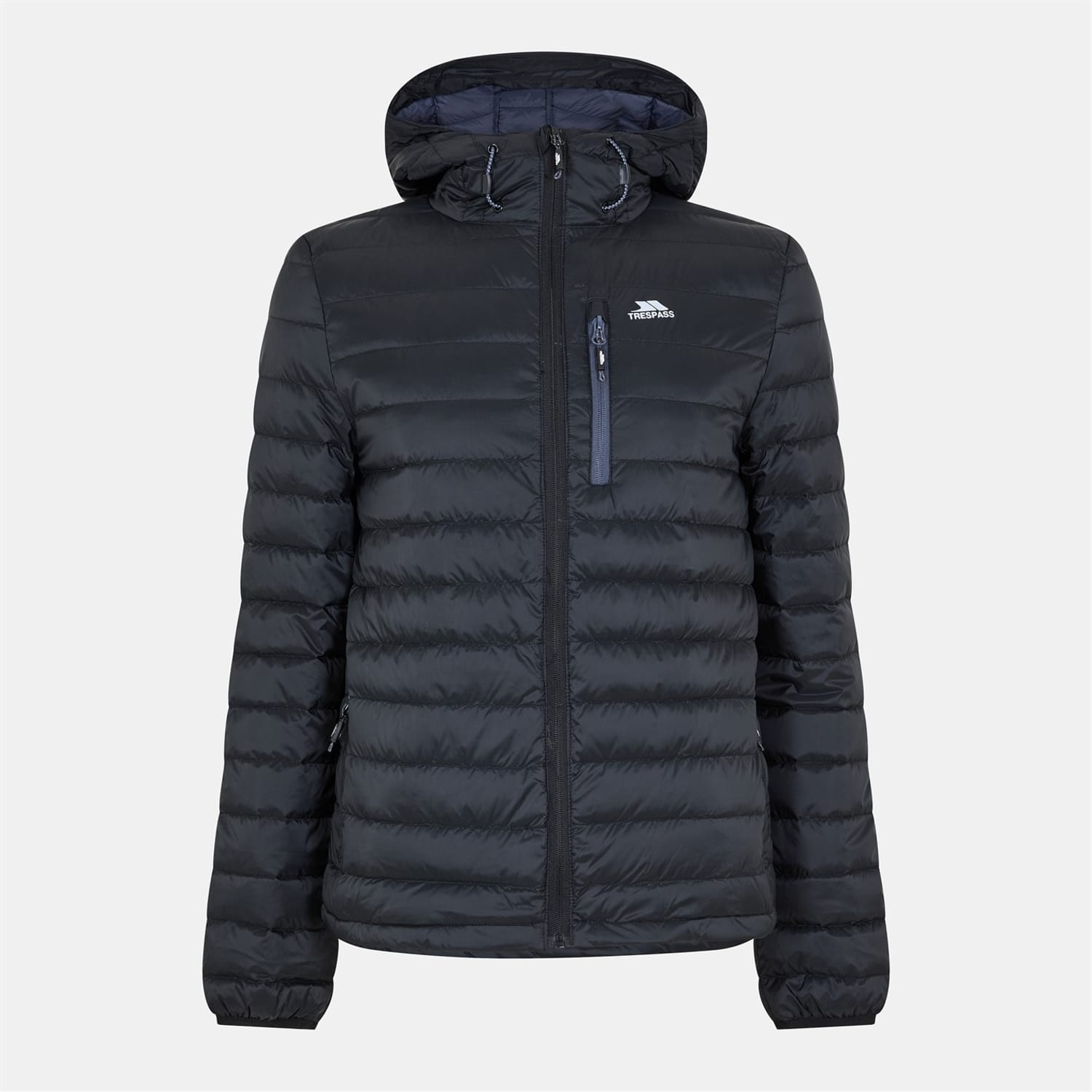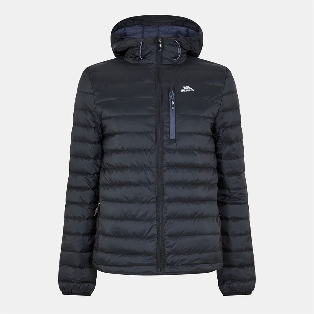 Trespass down jacket features a hooded neckline and a regular fit, offering warmth and comfort. The jacket includes a zipper closure and elasticated cuffs for a secure fit. It has a straight hem and a solid pattern, complemented by a logo and a chest pocket for added functionality. -
