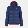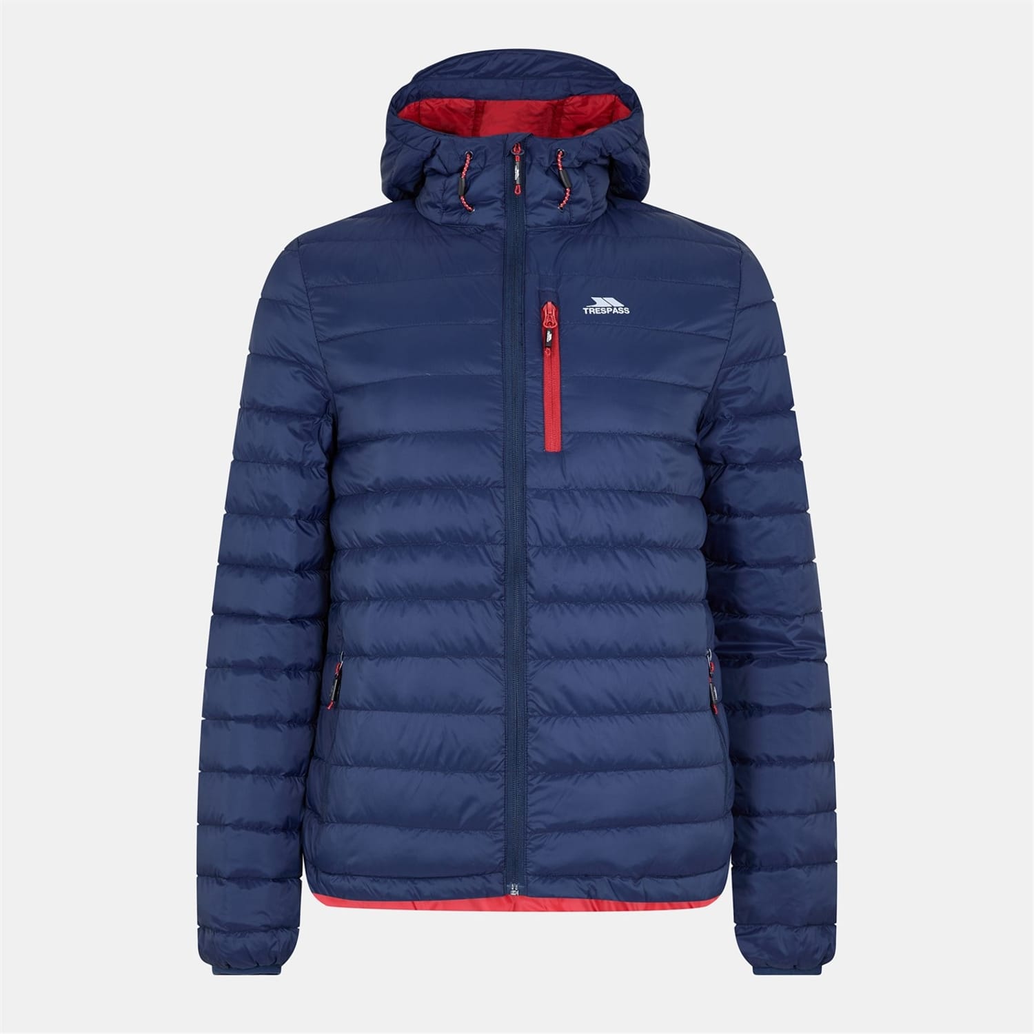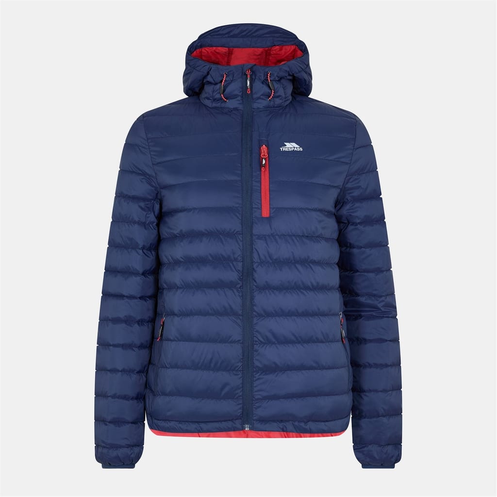 This Trespass down jacket is designed for comfort and practicality. Featuring a hooded neckline and a regular fit, it offers warmth with its down insulation. The jacket includes a zipper closure and ribbed cuffs for a secure fit. Embellished with a logo and zipped pockets, it combines functionality with style. The solid pattern and straight hem complete its sleek look. -