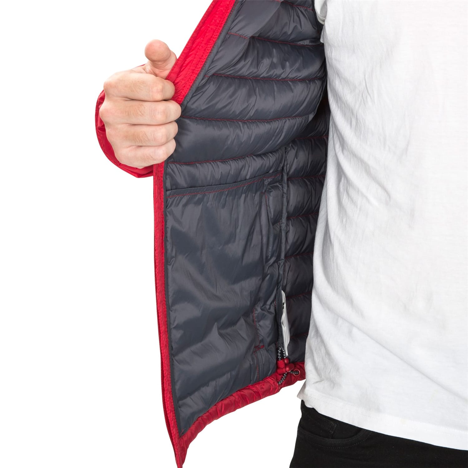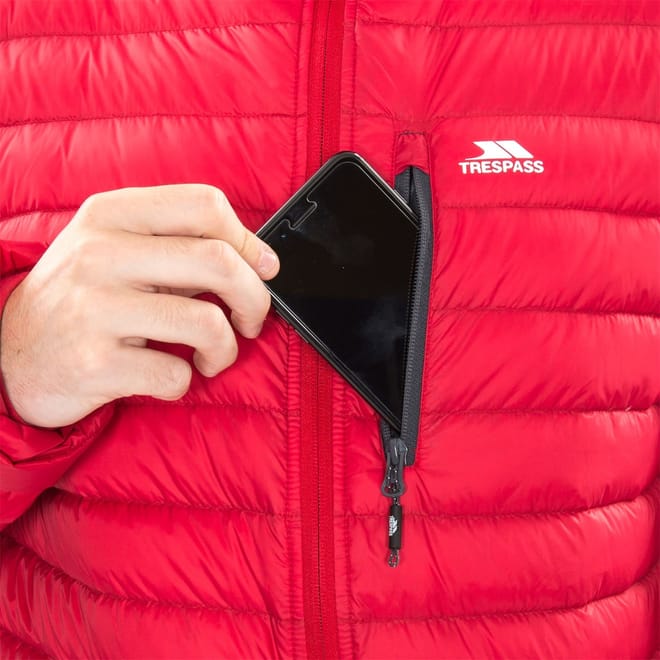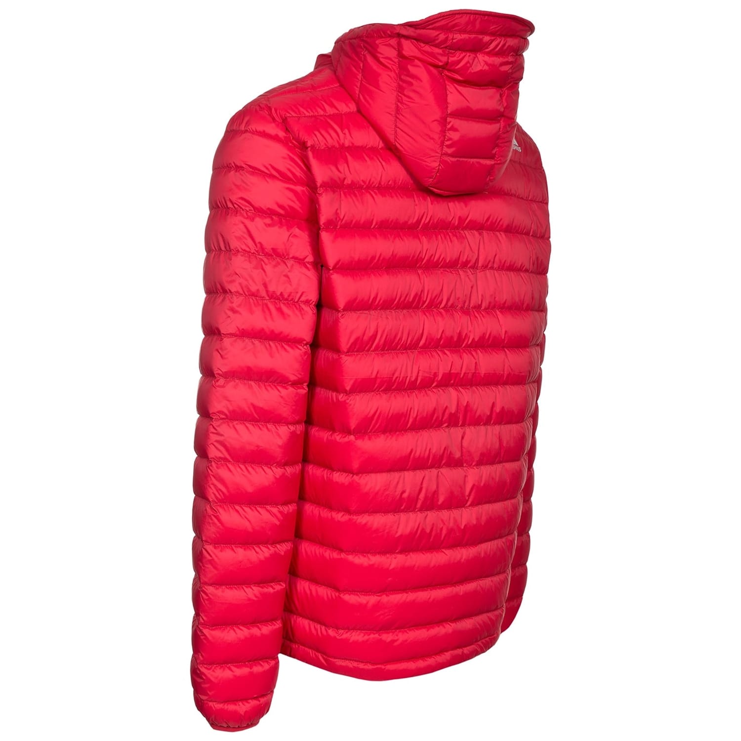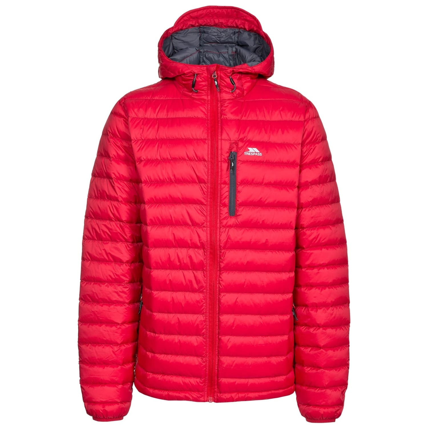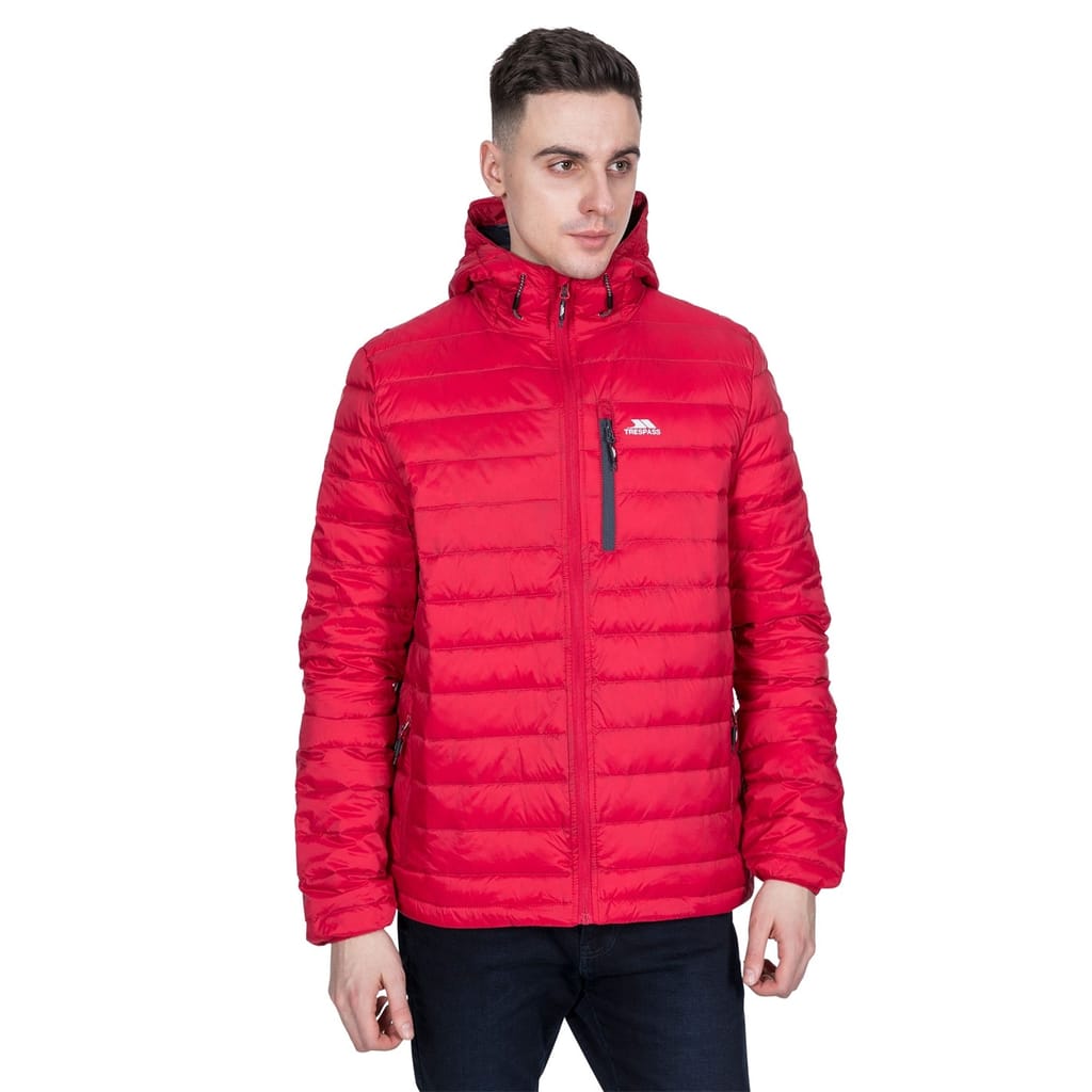 Trespass down jacket features a hooded neckline and a zipper closure, offering a regular fit. The solid pattern is complemented by practical zipped pockets and a subtle logo embellishment, making it a functional choice for cooler weather. -