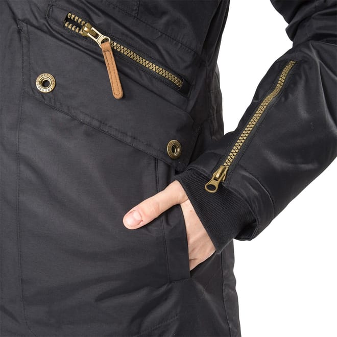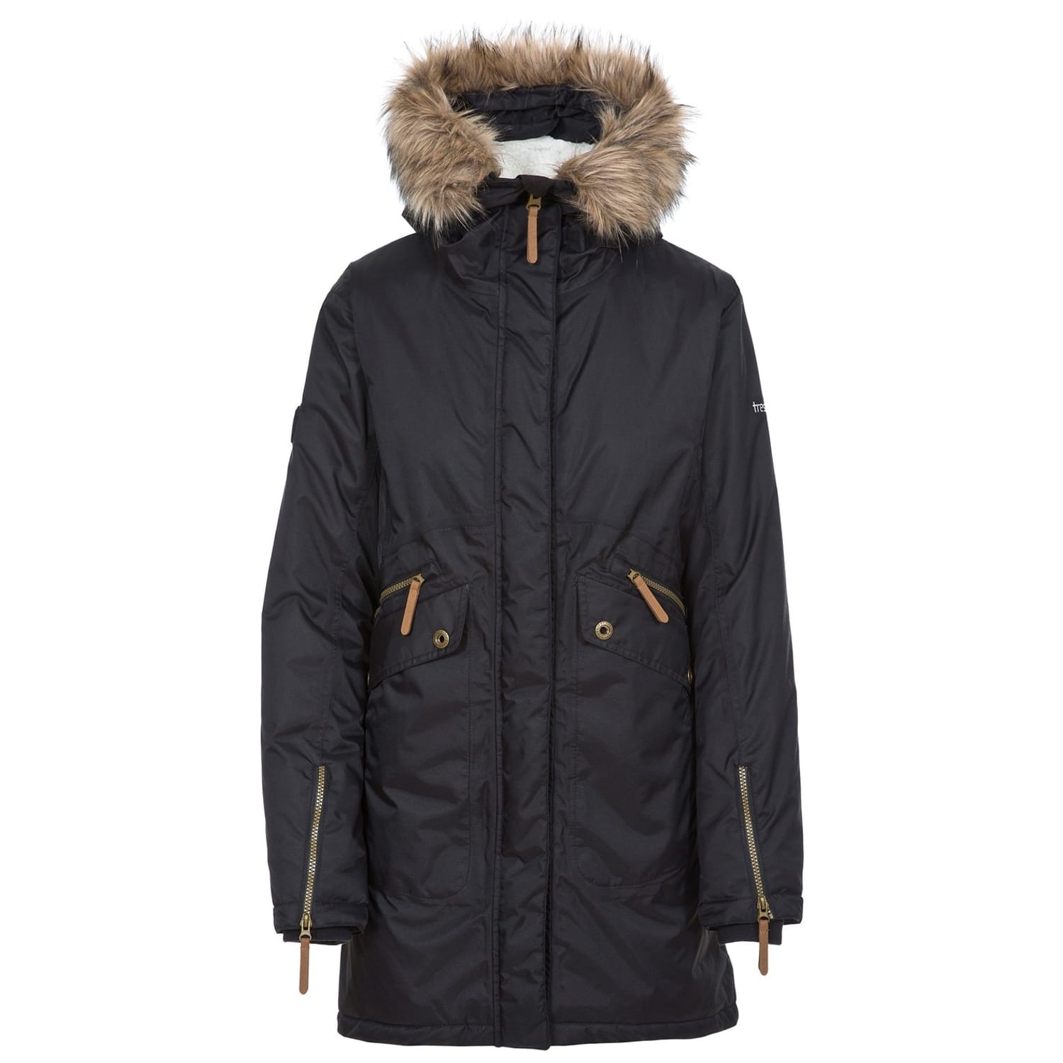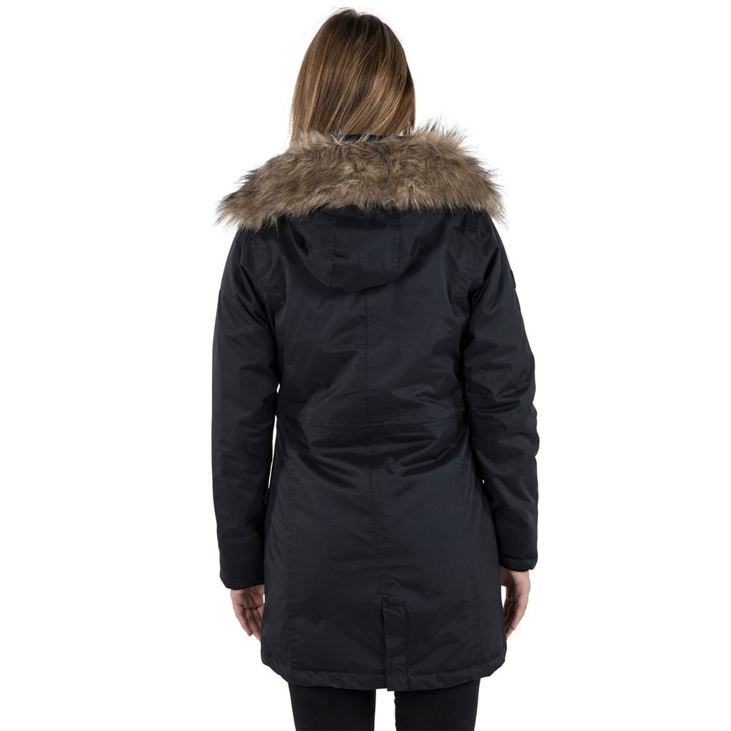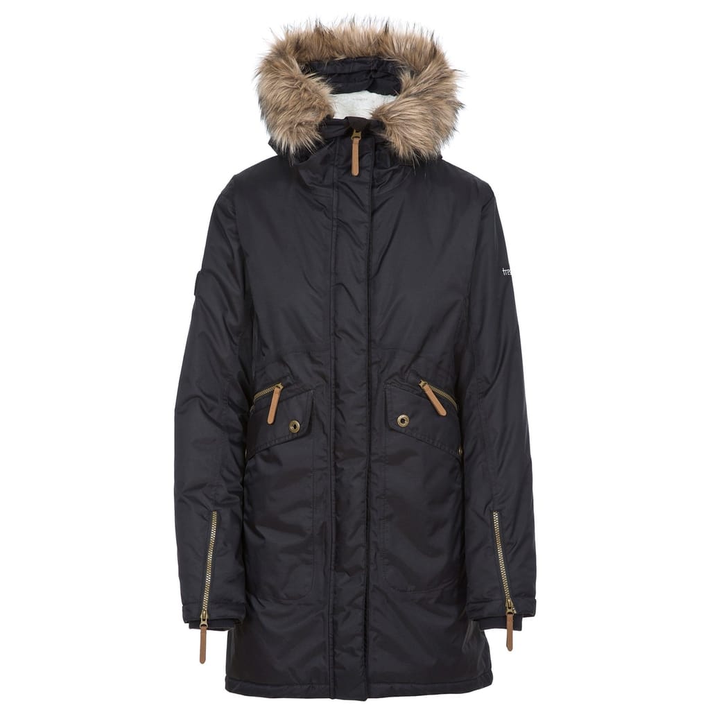 Trespass parka jacket features a hooded design with a water-repellent finish, ensuring protection against the elements. The jacket includes a zipper and snap closure, complemented by a straight hem. It offers a regular fit and is adorned with practical pockets, including zipped options, and a stylish fur trim. The solid pattern adds a classic touch. -