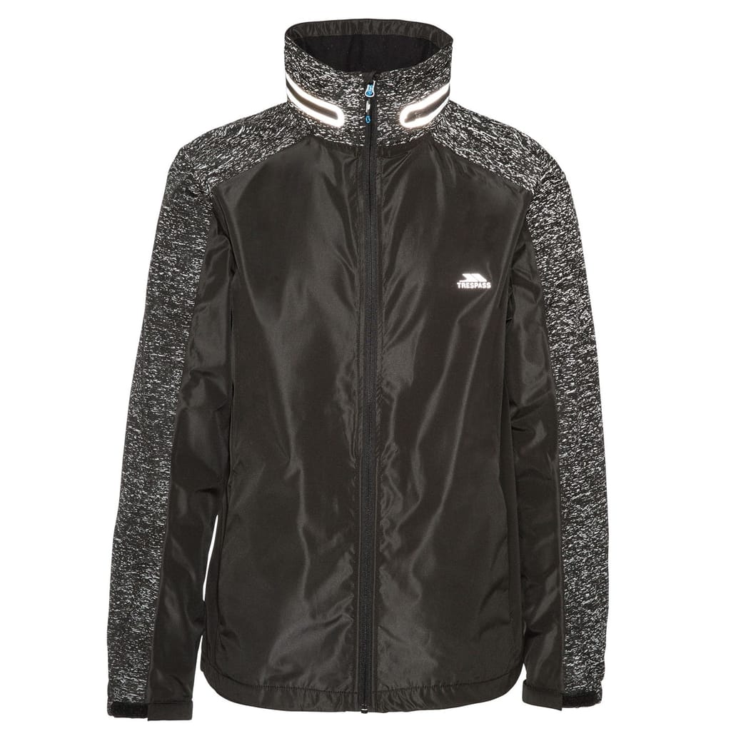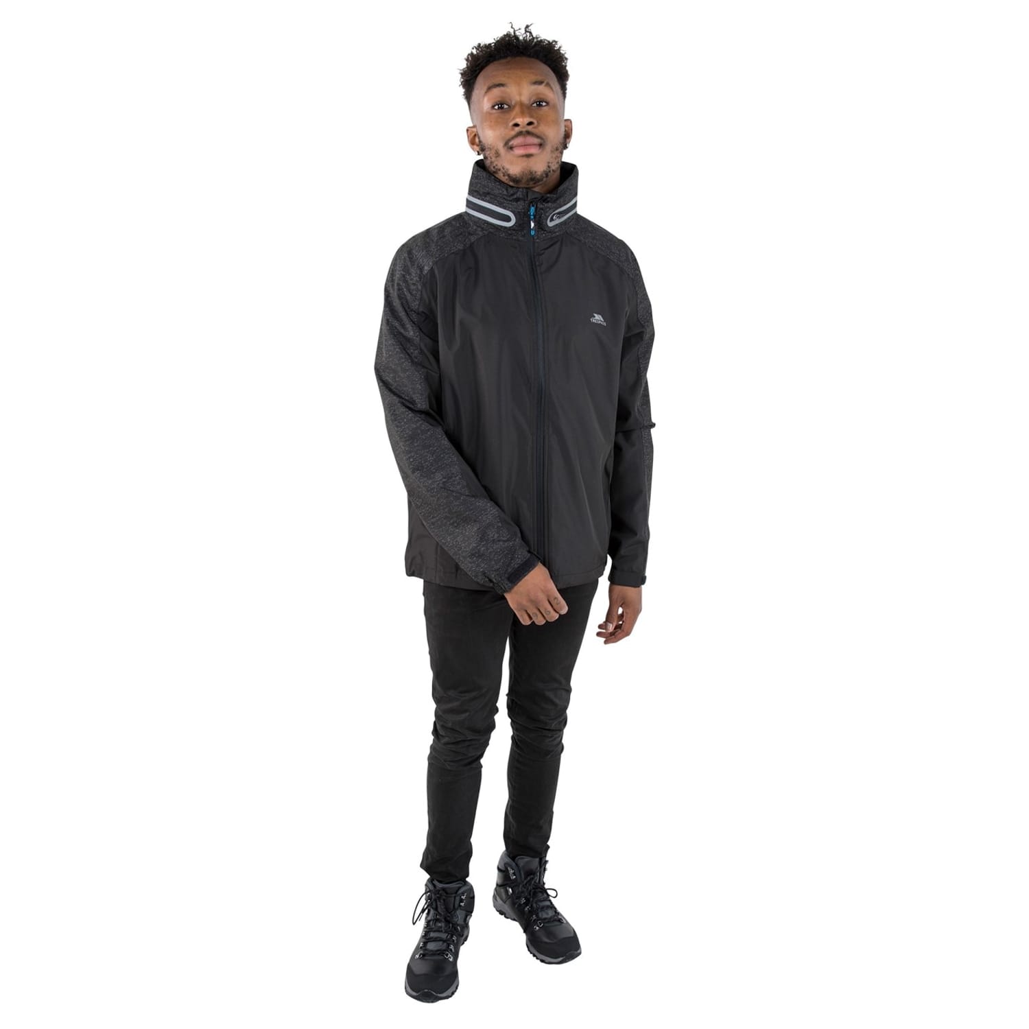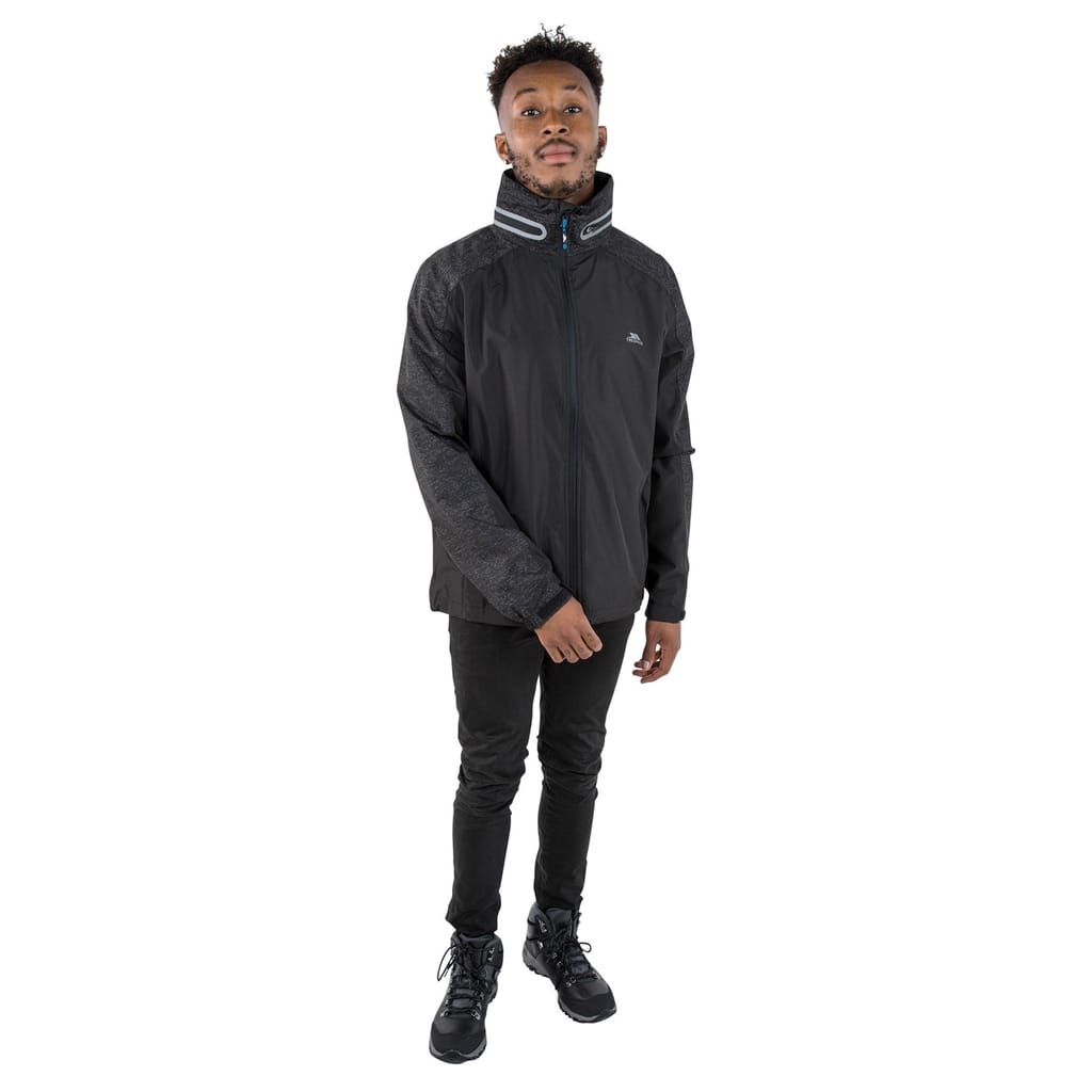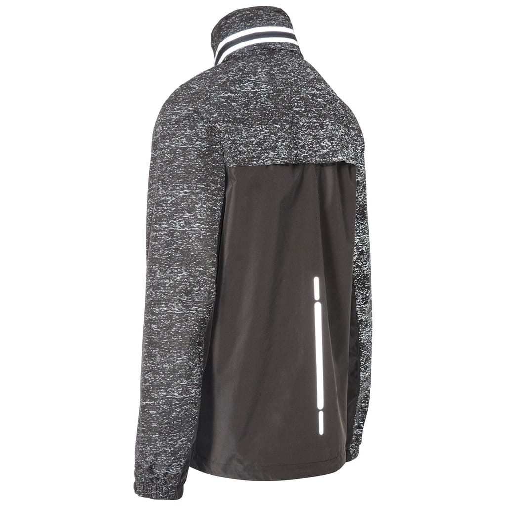 Trespass rain jacket features a marled pattern and a regular fit, designed with a zip neck and elasticated cuffs. The jacket is water repellent, ensuring protection against the elements. It includes a zipper closure and a straight hem. Embellished with a logo and reflective trim for added visibility. -