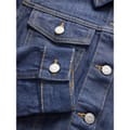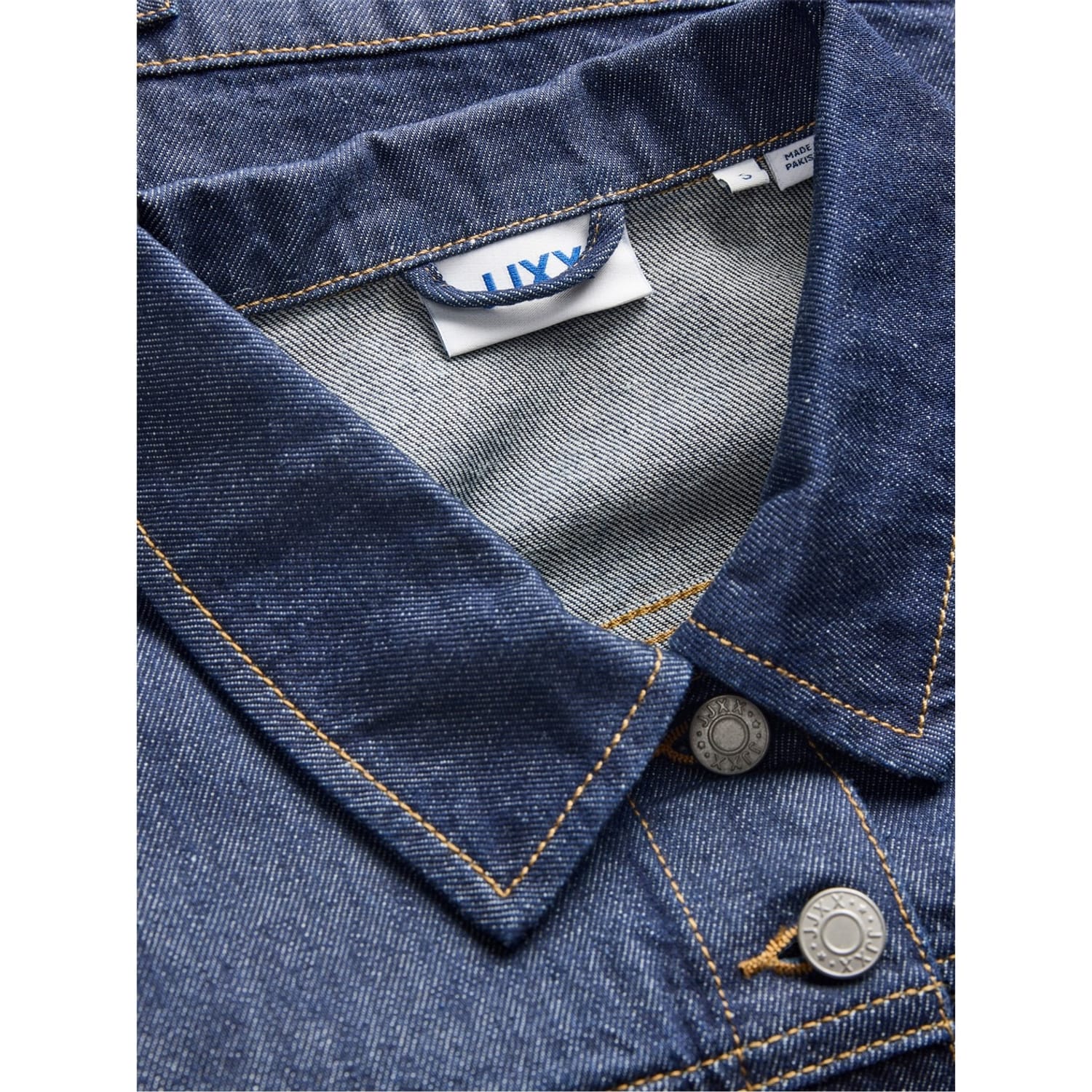 This JJXX denim jacket features a classic shirt collar and a button closure, offering a regular fit. The solid pattern and straight hem create a timeless look, while the short length adds a modern touch. Embellished with a subtle logo, this jacket is designed with cuff sleeves for added style. -
