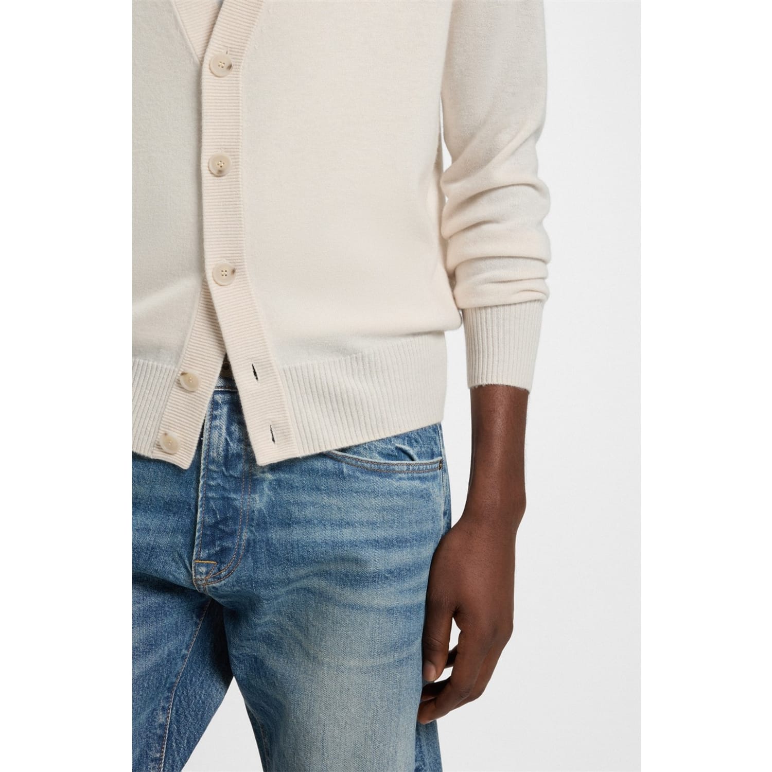 - Detailed with a V-neckline leading into a front button fastening, exuding a classic appeal.