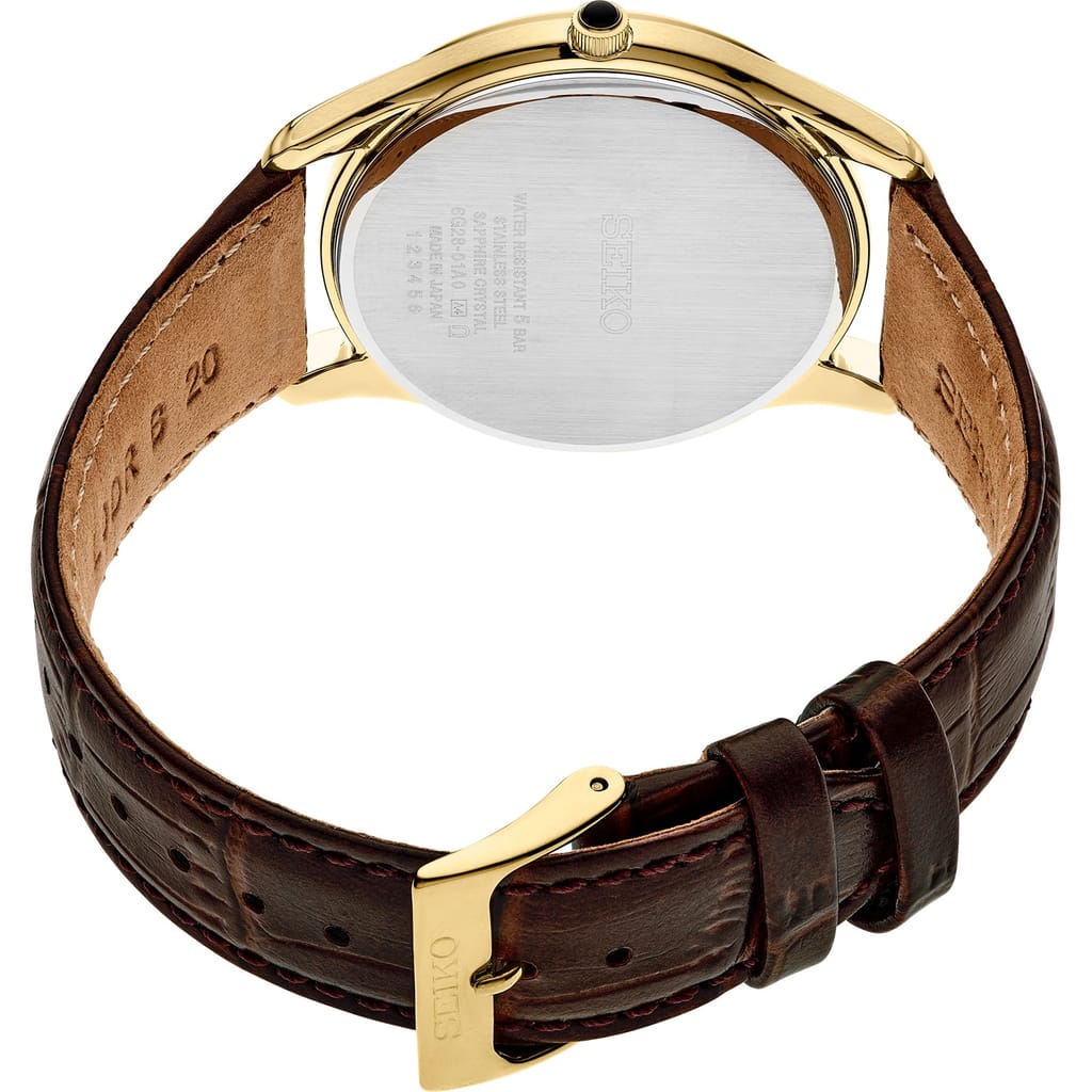 Seiko wrist watch features a classic analogue display with a pristine white dial. The elegant design is complemented by a durable leather strap, making it a timeless accessory for any occasion. -