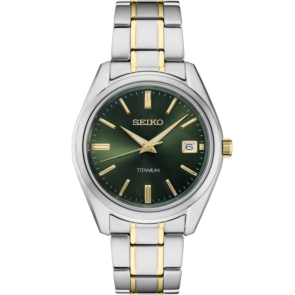 Discover the elegance of Seiko with this wrist watch, featuring a striking green dial. The analogue display ensures timeless appeal, while the titanium bracelet strap offers durability and a sleek finish. Perfect for those who appreciate quality craftsmanship and sophisticated design in their timepieces. -