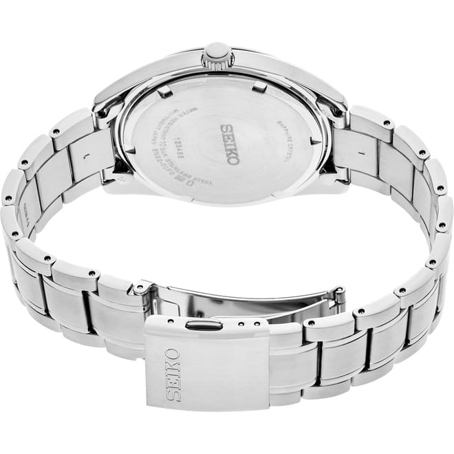 Seiko presents a sophisticated wrist watch featuring an elegant white dial and an analogue display. The watch is crafted with a durable steel bracelet strap, ensuring both style and comfort. This timepiece is a perfect blend of functionality and timeless design, making it an ideal choice for those who appreciate quality craftsmanship. -