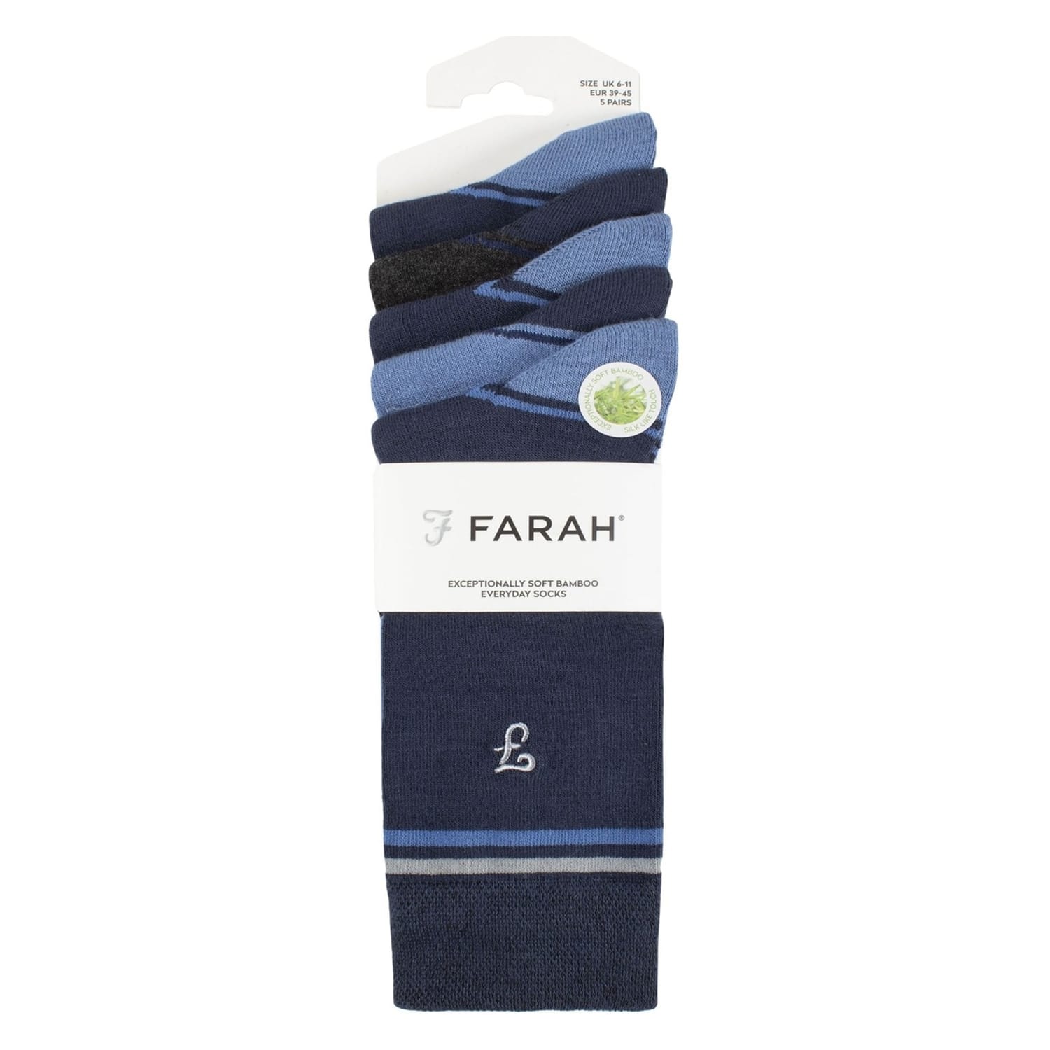 Big five-pair packs of men’s bamboo socks to freshen up your sock drawer, every set of these Farah Plain, Striped and Patterned Everyday Bamboo Socks has a carefully-chosen collection of colour-co-ordinating styles. Great for everyday wear, work to casual, the socks are lightweight and fine gauge, so they’re breathable and easy to wear. An embroidered Farah ‘F’ decorates the side legs of all these socks.