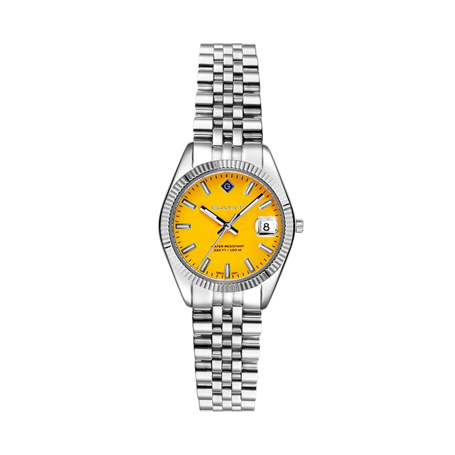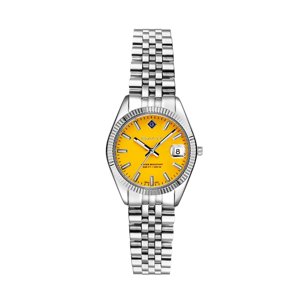 Discover the elegance of Gant wrist watch, featuring a striking yellow dial and an analogue display. This timepiece is crafted with a durable steel jubilee strap, offering both style and comfort. With a water resistance of up to 100m, it is perfect for those who appreciate functionality and design in their watches. -