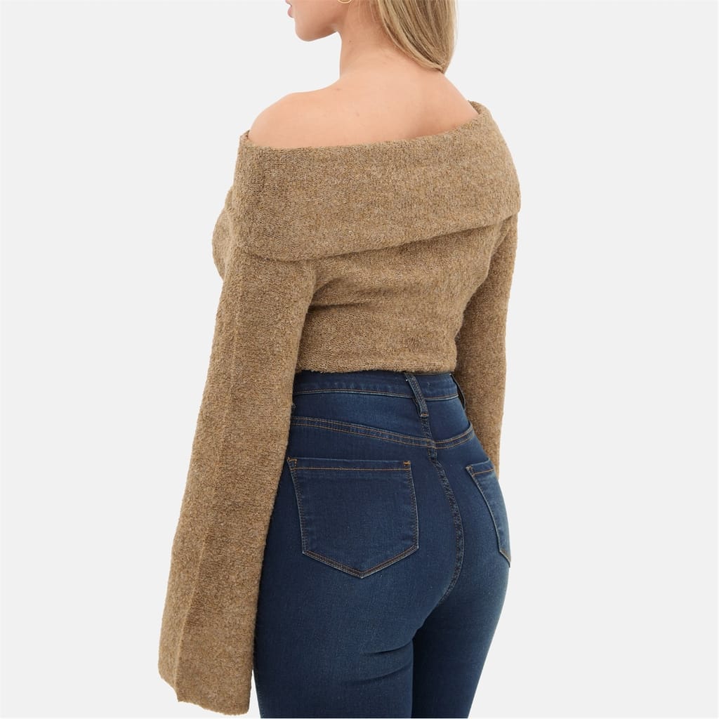 Soft, textured, and effortlessly chic, this bouclé bandeau jumper is a standout layering piece. Crafted from a plush bouclé knit, it features a strapless bandeau silhouette that brings a modern edge to cosy knitwear. -