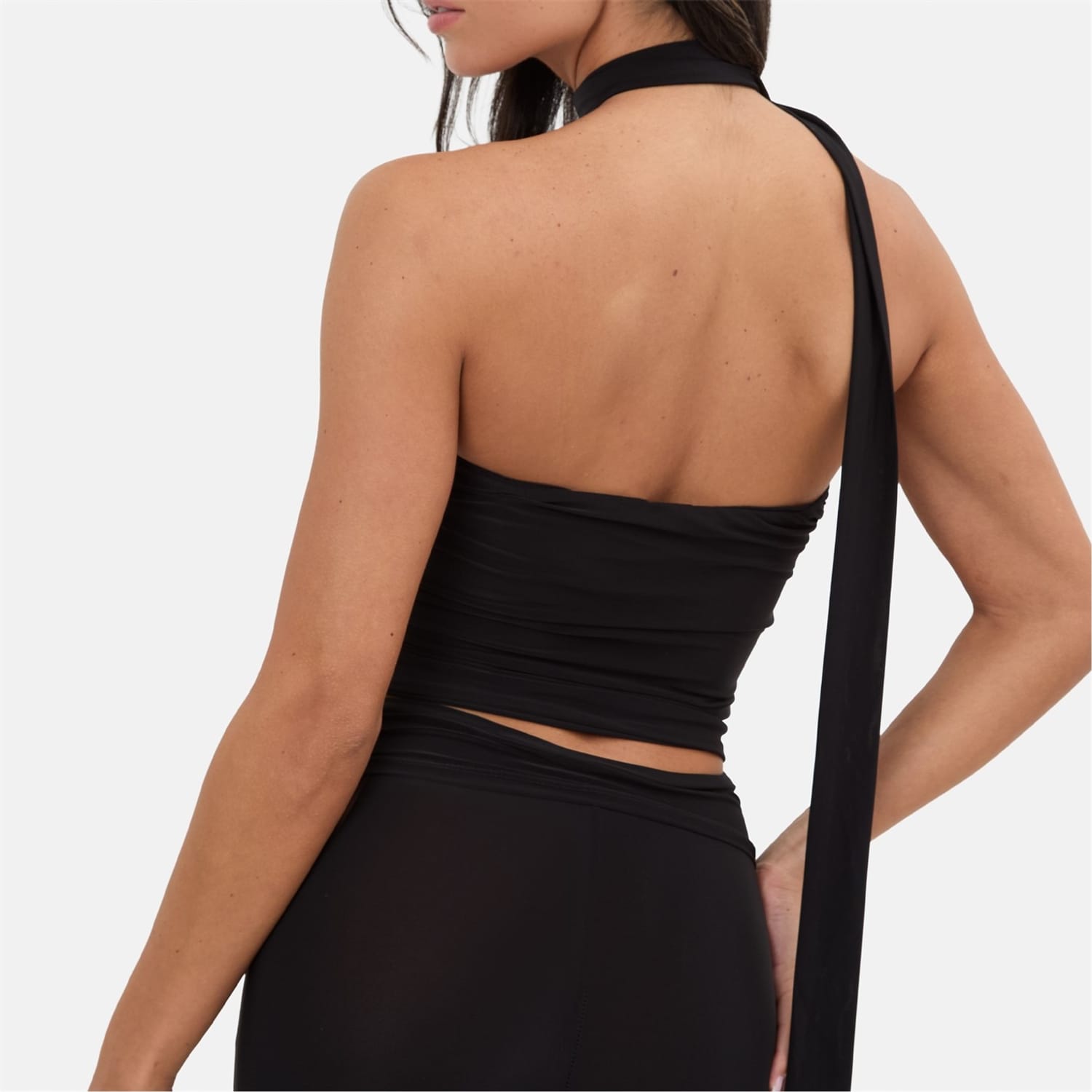 A chic and contemporary statement piece, the slinky scarf top features a smooth, silky fabric that drapes effortlessly over the body. Designed with a flowing, scarf-inspired neckline, it adds a touch of elegance and fluidity to any outfit.