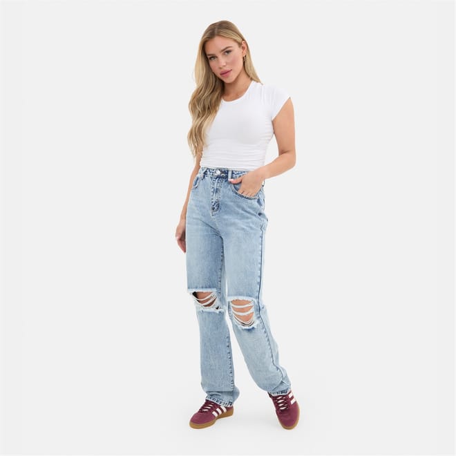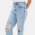 A timeless denim silhouette with a rebellious edge, the ripped mom jean combines vintage-inspired style with contemporary attitude. Crafted from sturdy, non-stretch denim for an authentic feel, it features a high-rise waist, relaxed fit through the hips and thighs, and a tapered leg for a flattering, laid-back shape. -