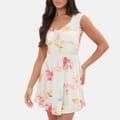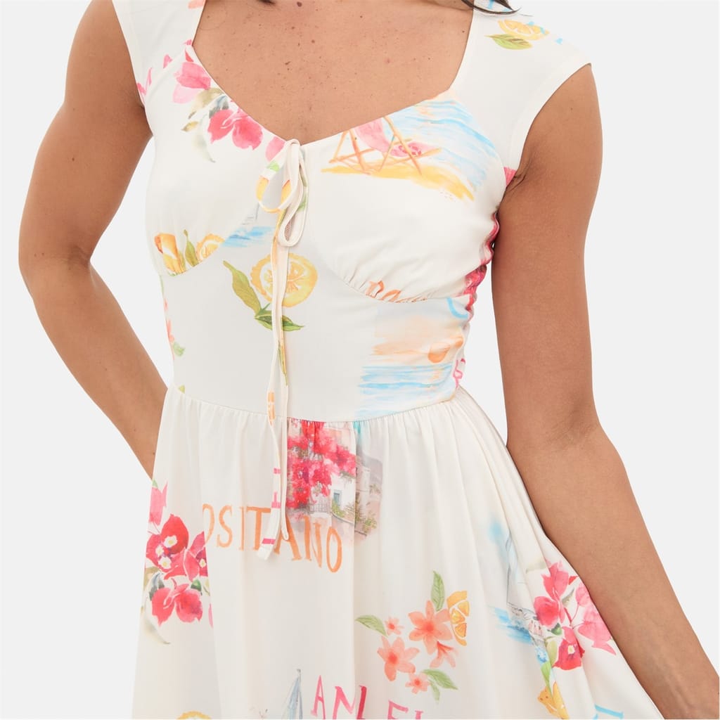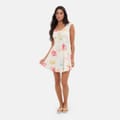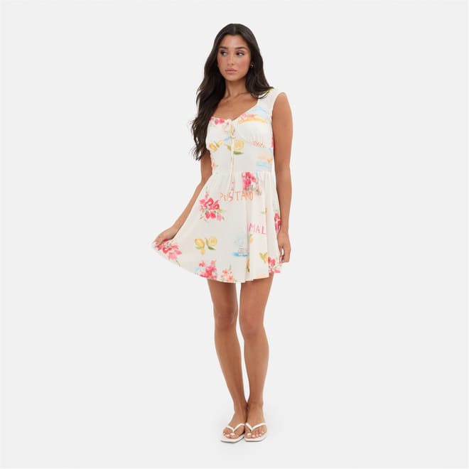 Playful and feminine, this printed tie front mini dress features a vibrant all-over print that adds personality and charm. Designed with a flattering tie-back detail and drop waist design, it cinches to create a beautifully defined silhouette. -