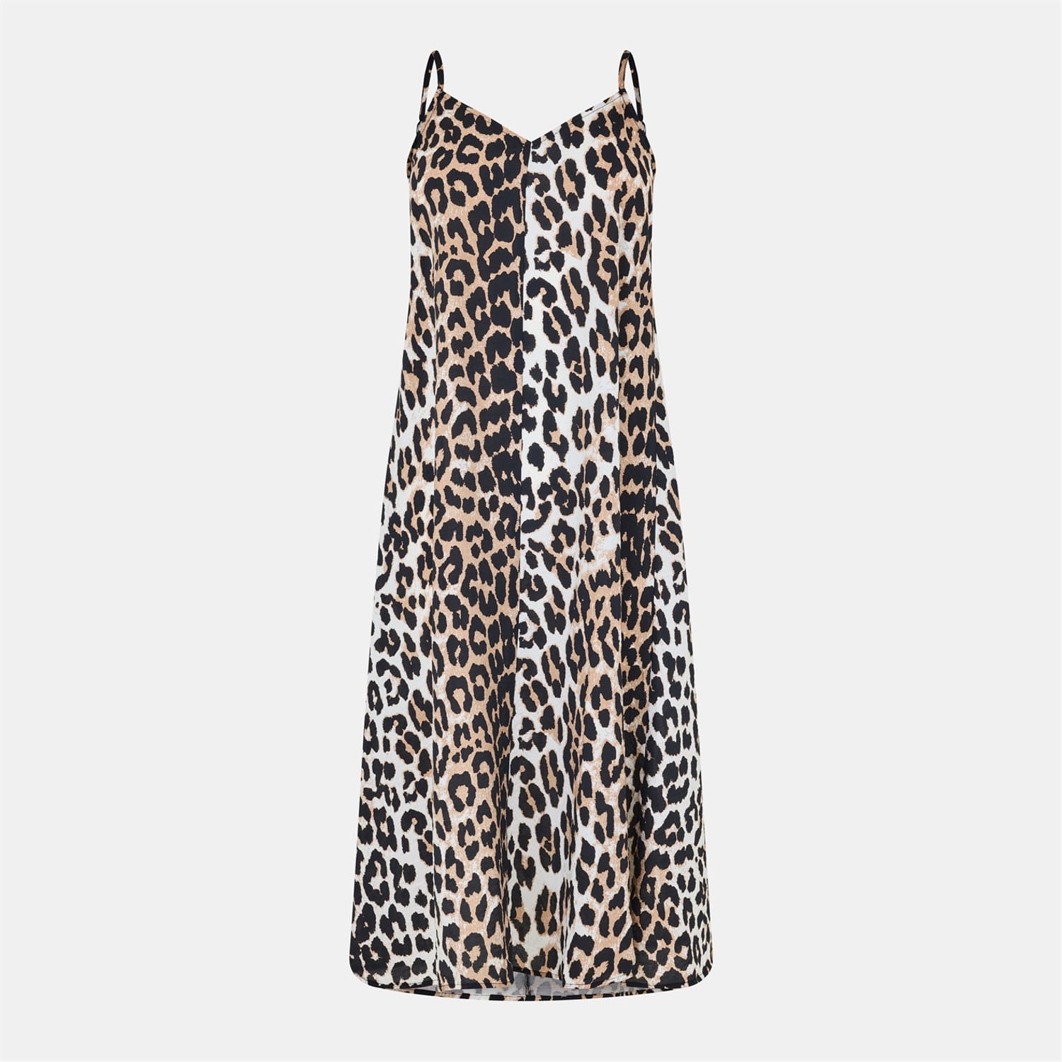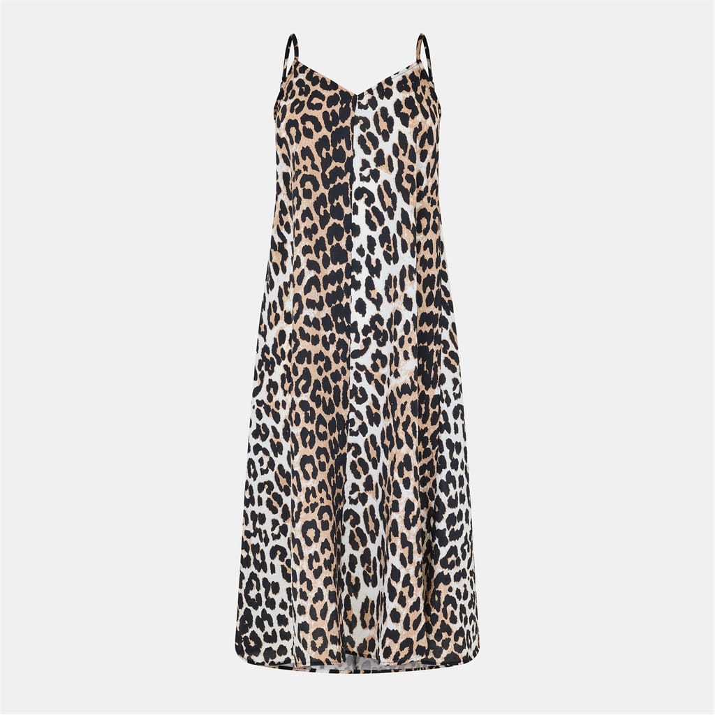 This Vero Moda slip dress features a striking leopard pattern, perfect for making a statement. The midi length and spaghetti strap neckline offer a chic and modern look. The straight hemline adds a touch of elegance, making it a versatile addition to any wardrobe. -