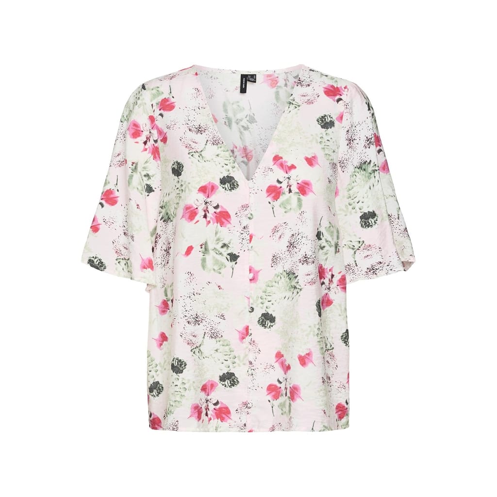 This Vero Moda top features a relaxed fit with a charming floral pattern. The short sleeves and woven fabric make it a versatile addition to your wardrobe. The V-neck design adds a touch of elegance, perfect for various occasions. -