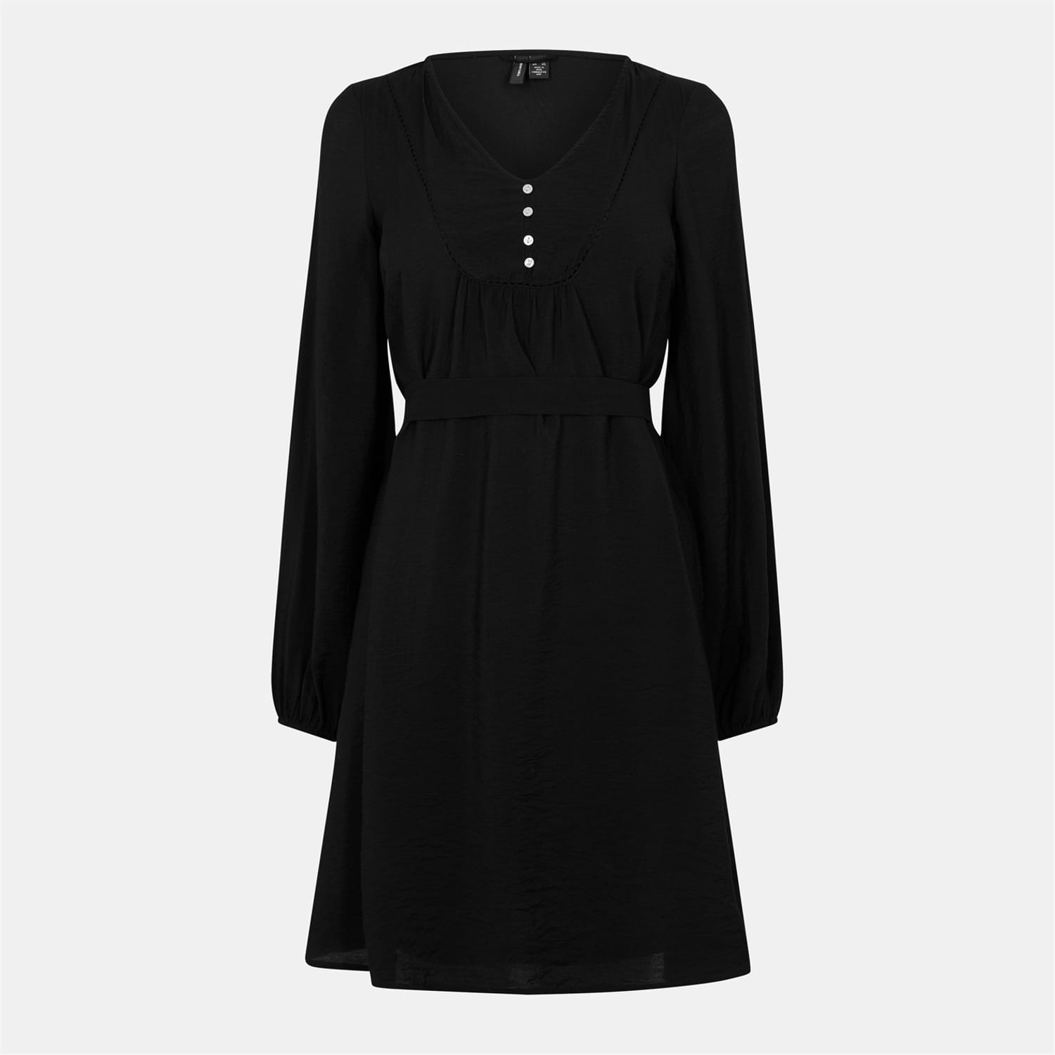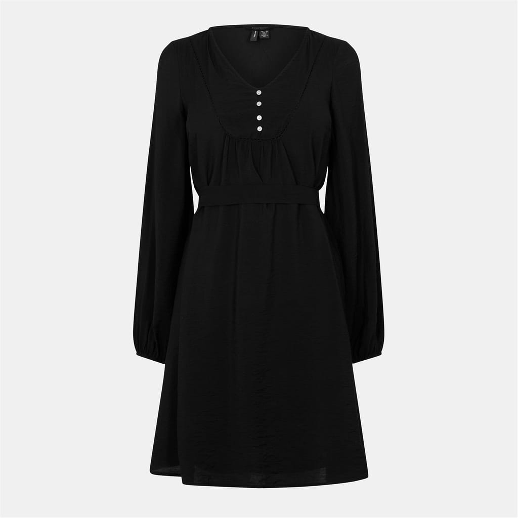 This Vero Moda mini dress features a classic A-line style with a solid pattern. The dress is designed with a flattering V-neck and puff long sleeves, adding a touch of elegance. The straight hemline completes the look, making it a versatile choice for various occasions. -