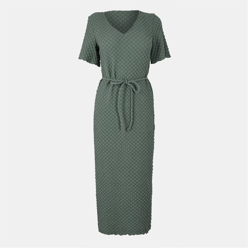 This Vero Moda midi dress features a textured pattern and a flattering A-line style. The dress is designed with a V-neck and short puff sleeves, adding a touch of elegance. A tie waist closure enhances the fit, while ruffle embellishments and a bubble hem complete the look, making it a versatile choice for various occasions. -