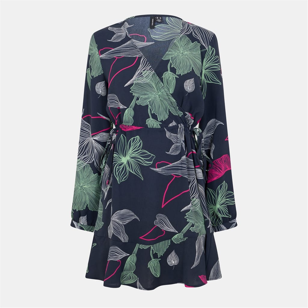 This Vero Moda mini wrap dress features a charming floral pattern and a v-neckline. The long balloon sleeves add a touch of elegance, while the ruffle hem and embellishments enhance its playful style. A tie waist closure ensures a flattering fit, making it a versatile addition to any wardrobe. -