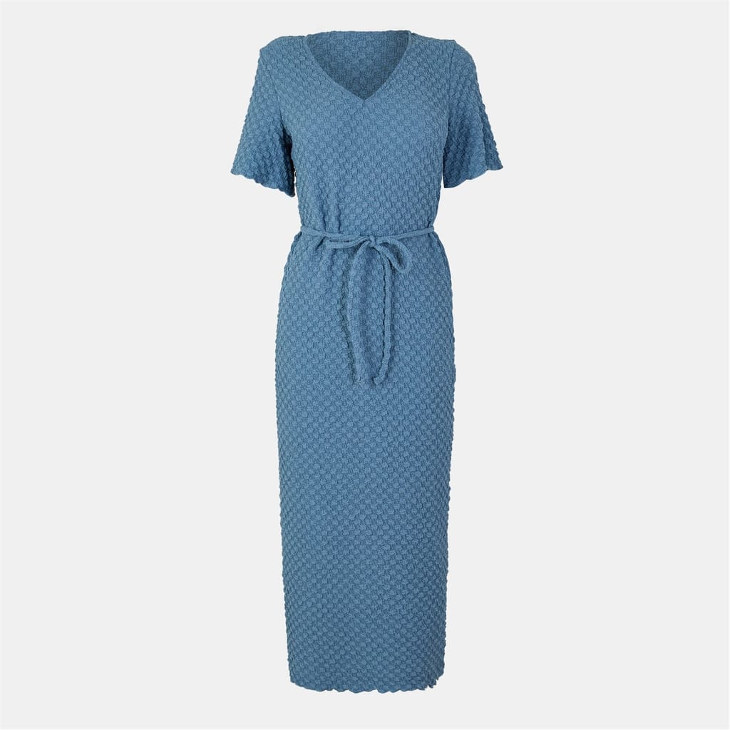 This Vero Moda midi dress features a textured pattern and a flattering A-line style. The dress is designed with a V-neck and short ruffle sleeves, adding a touch of elegance. The bubble hem enhances its unique silhouette, while the tie waist closure provides a customizable fit. Perfect for those seeking a stylish and sophisticated look. -