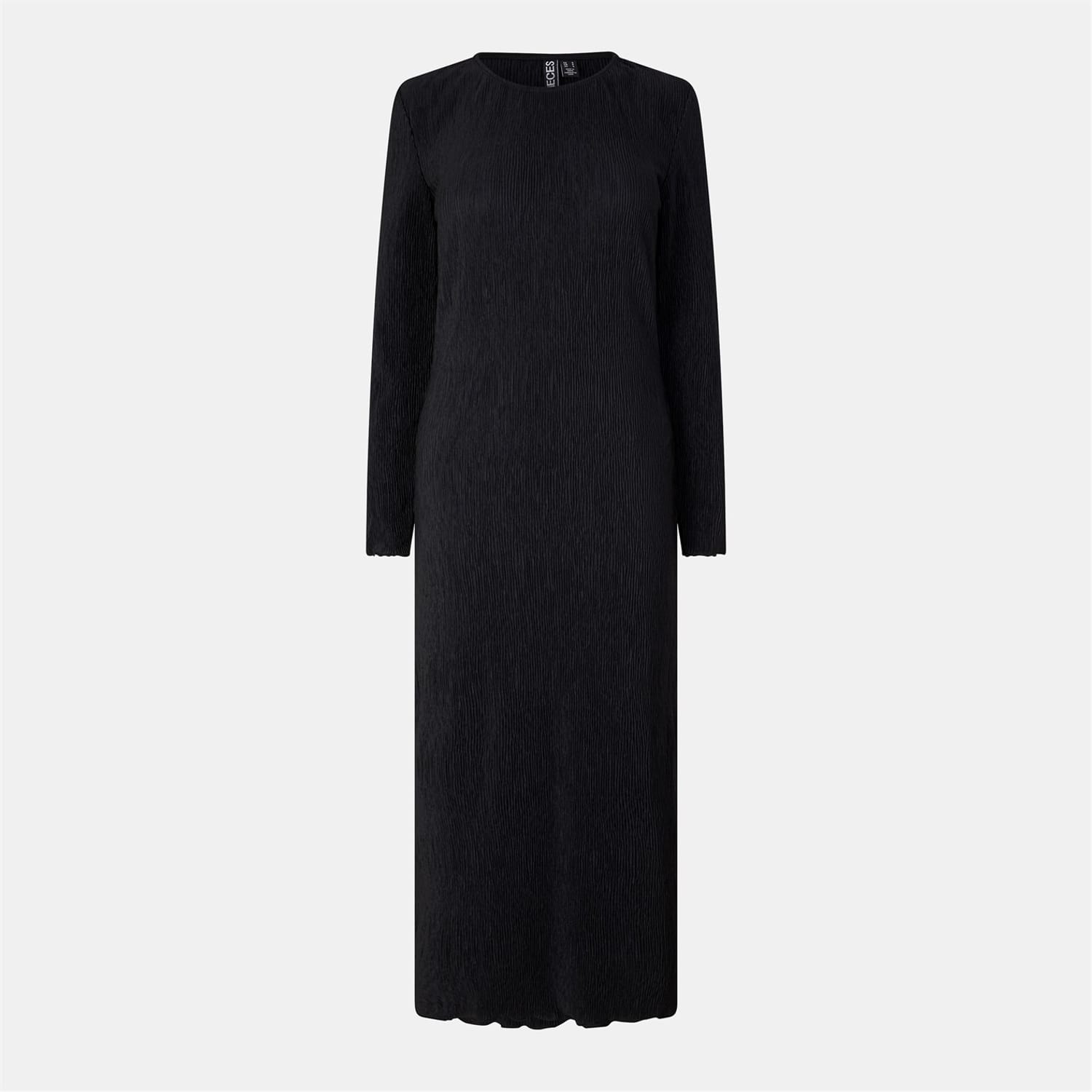 This Pieces maxi dress features a ribbed pattern and a classic crew neck. Designed in an elegant A-line style, it offers a sophisticated look with its curved hem. The long sleeves add a touch of refinement, making it a versatile choice for various occasions. -