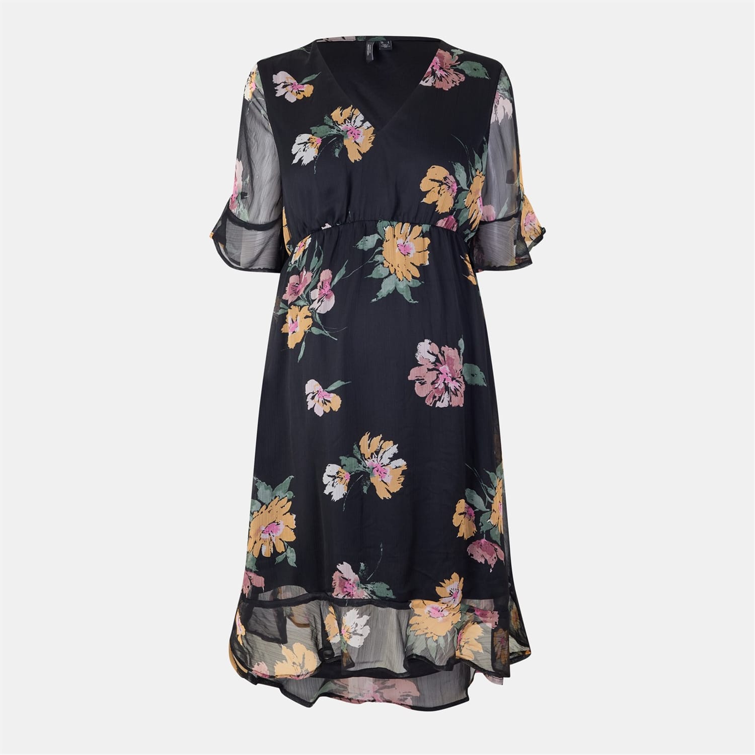 This Vero Moda midi dress embodies a charming milkmaid style with a floral pattern. It features a v-neck and three-quarter ruffle sleeves, complemented by a ruffle hem. The dress is adorned with ruffle embellishments, adding a touch of elegance to its design. -