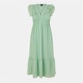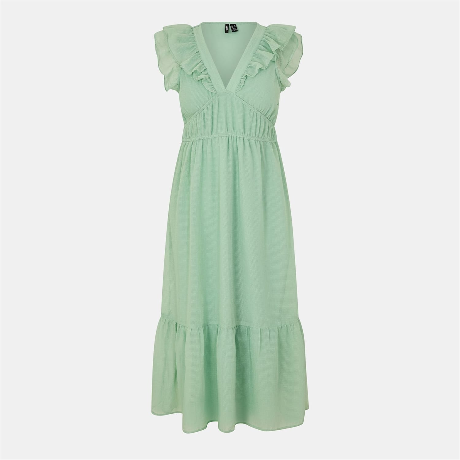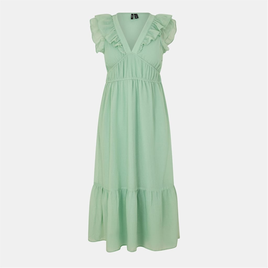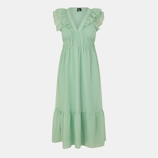 This Vero Moda midi dress features a tiered style with a v-neckline and a solid pattern. The dress is adorned with ruffle embellishments, including a ruffle hem, adding a touch of elegance to its design. -