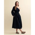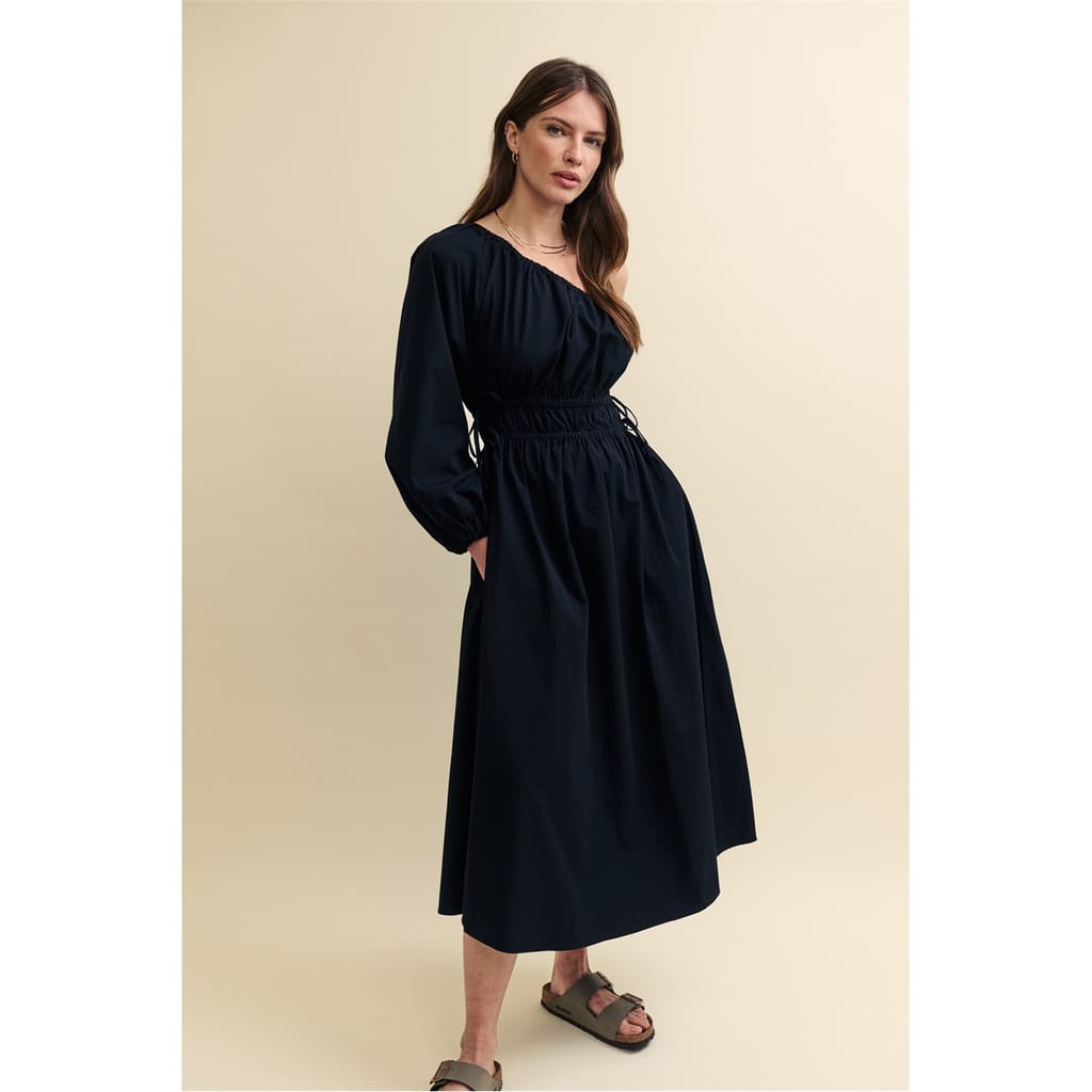 Discover the elegance of Nobody's Child midi dress, featuring a one-shoulder neckline and a solid pattern. This bodycon style offers a slim fit, complemented by a straight hem. The dress is designed with long sleeves and includes a practical pocket, making it a versatile addition to your wardrobe. -