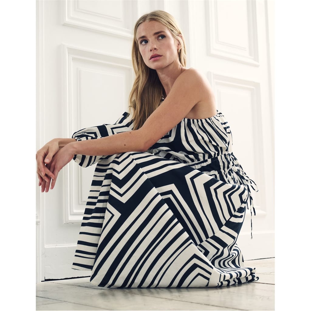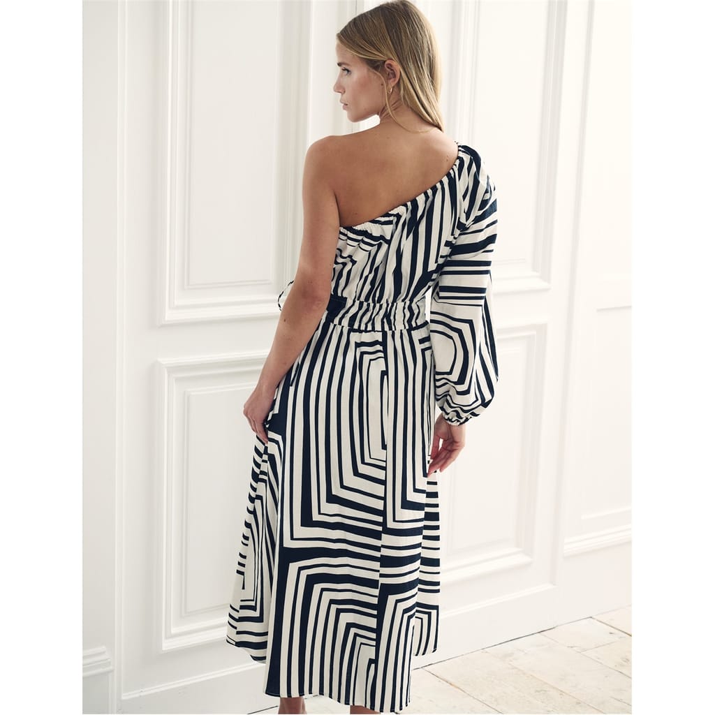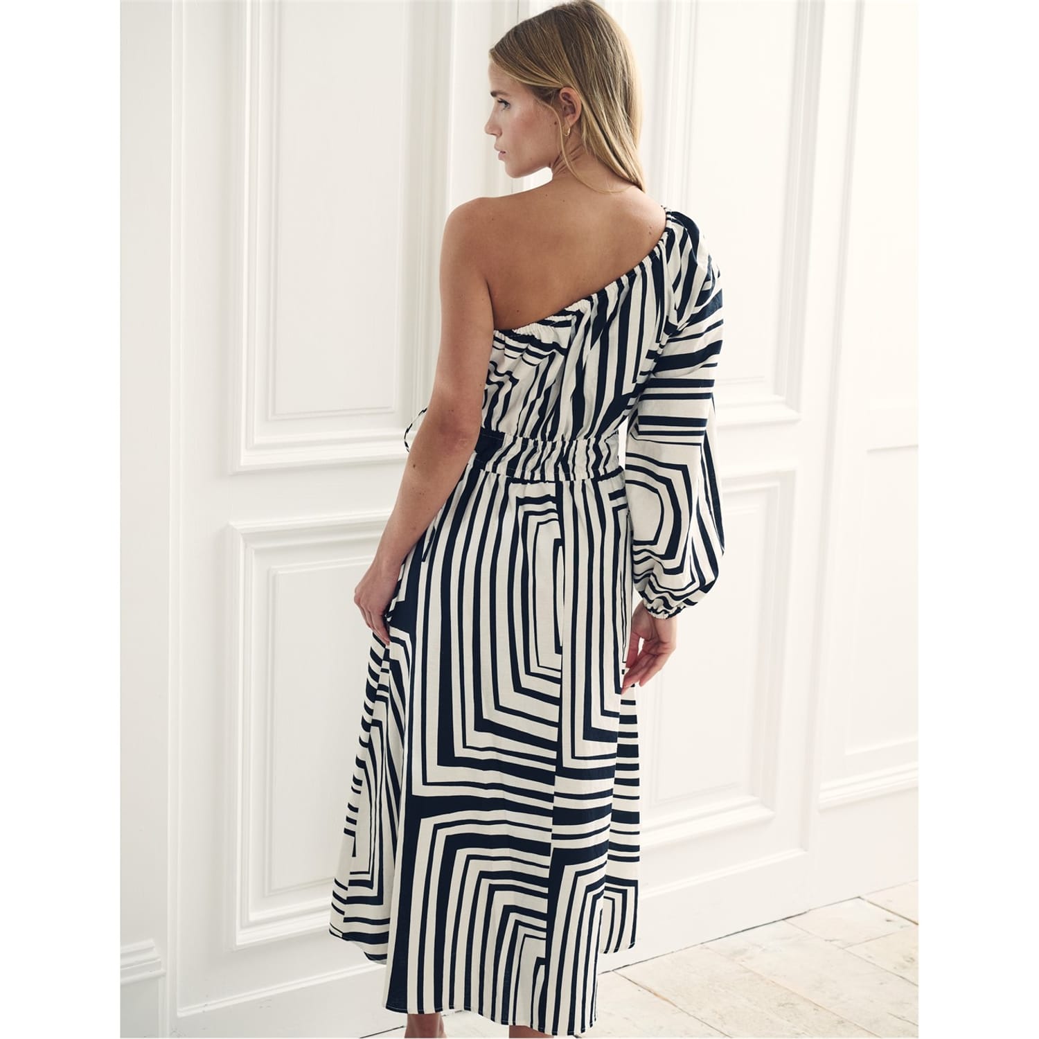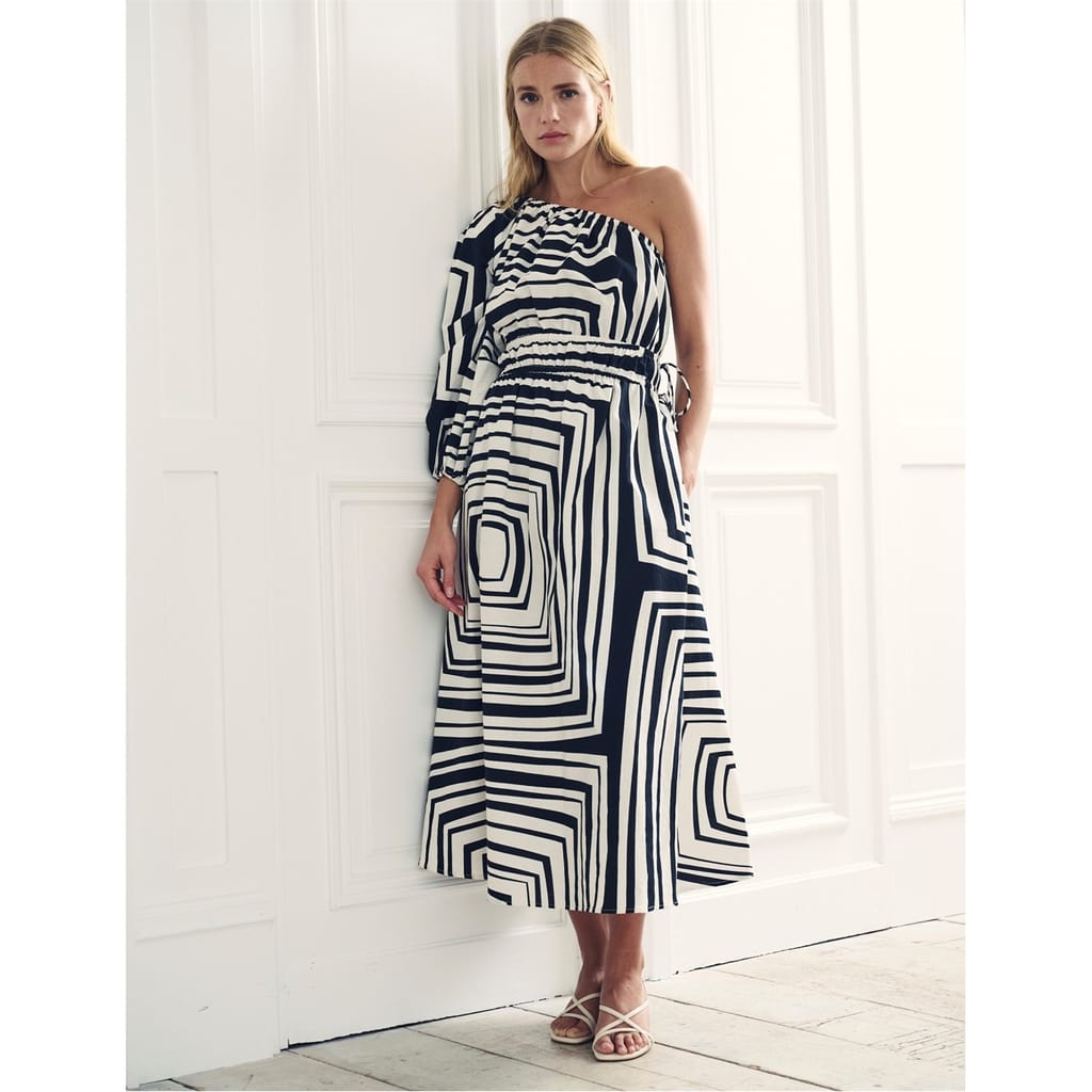 This midi dress from Nobody's Child features a striking geometric pattern and a one-shoulder neckline. Designed in a bodycon style, it offers a slim fit that accentuates the silhouette. The long puff sleeves add a touch of elegance, while the practical pocket embellishment enhances its functionality. -