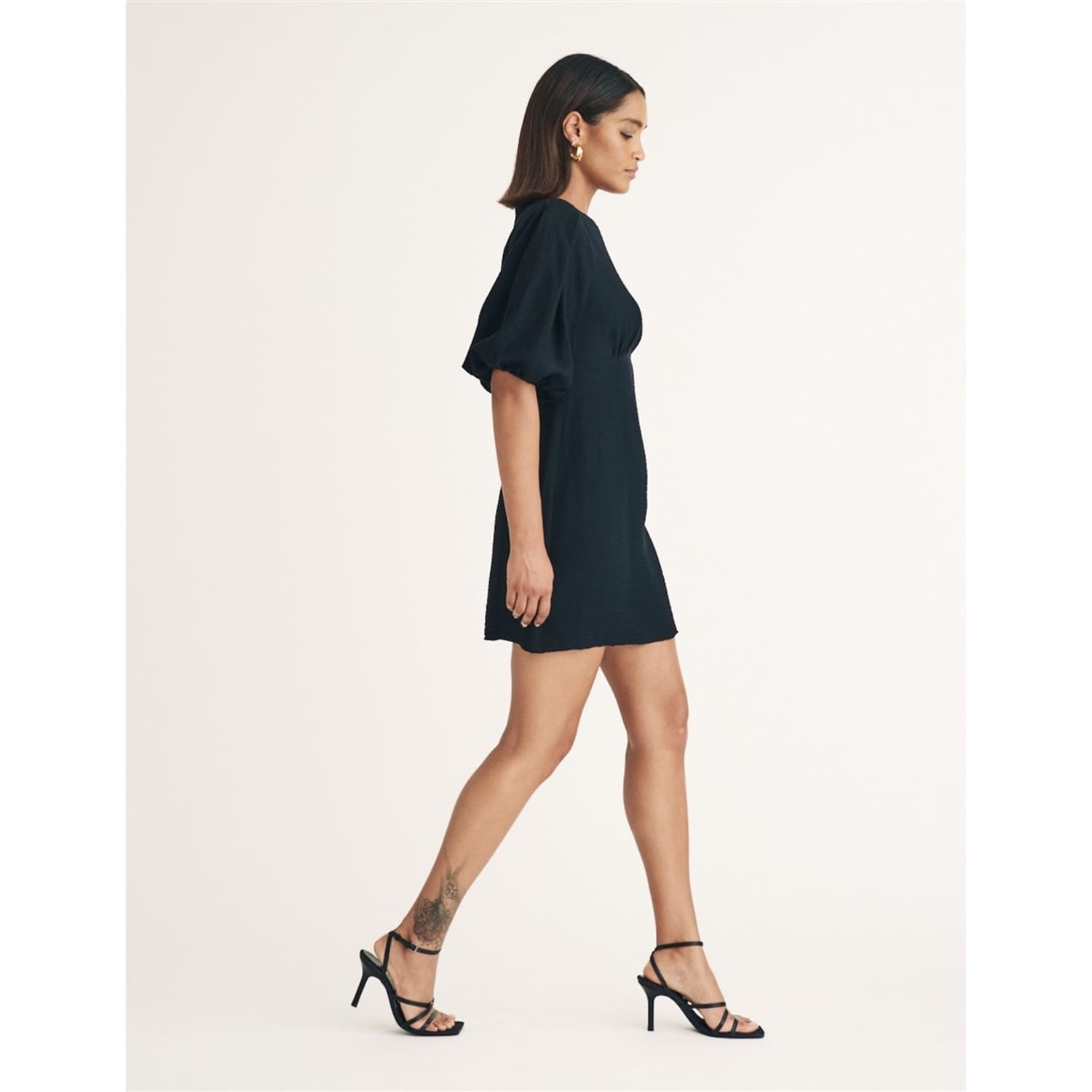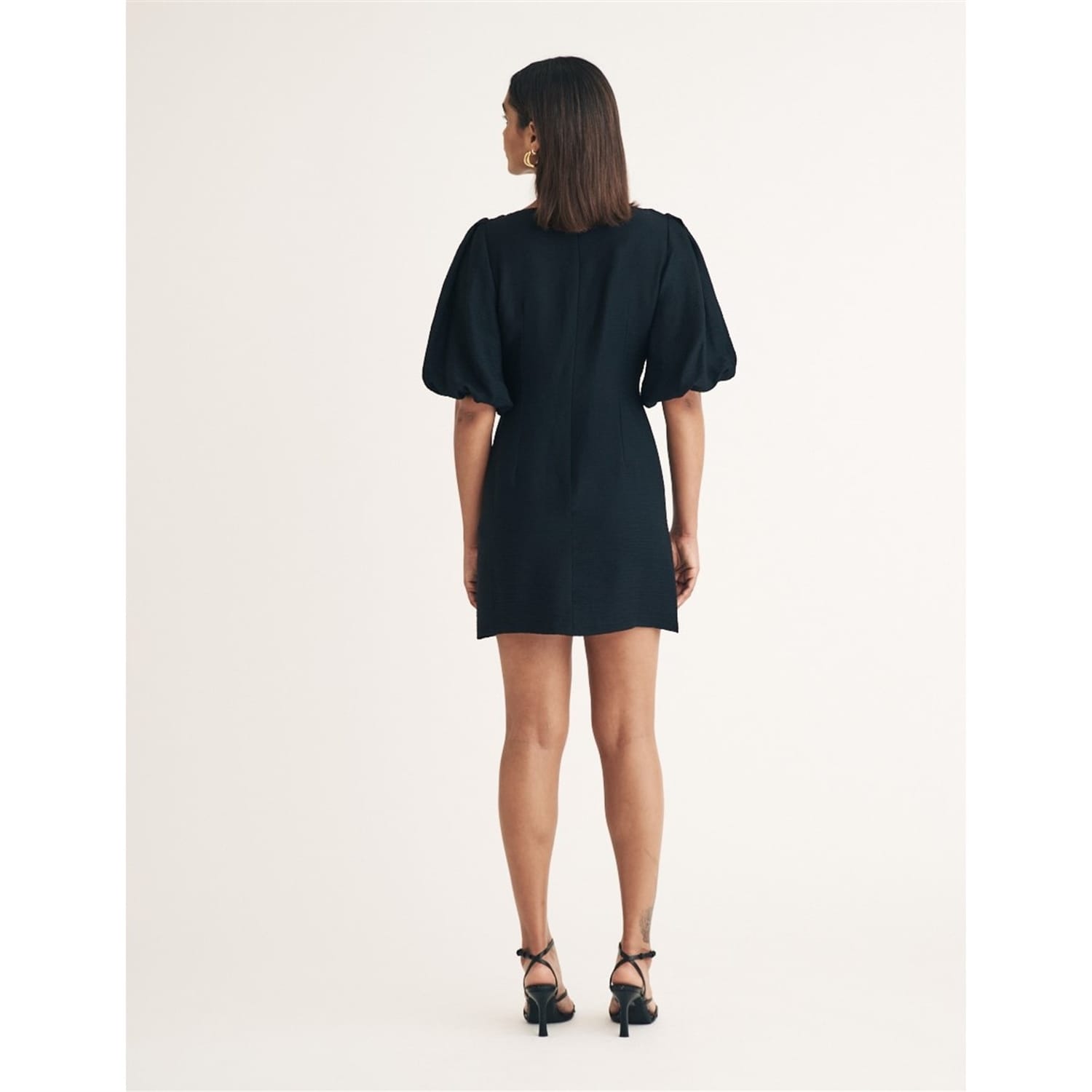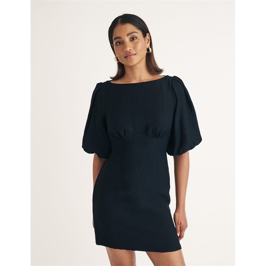 This mini dress from Nobody's Child features a boat neck and three-quarter puff sleeves, offering a stylish and modern look. The solid pattern and slim fit create a sleek silhouette, perfect for any occasion. -