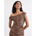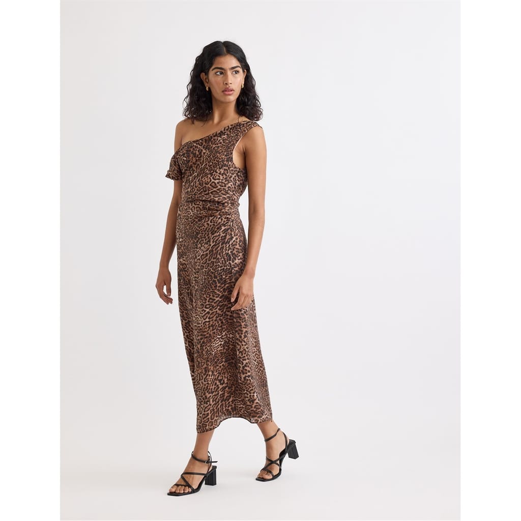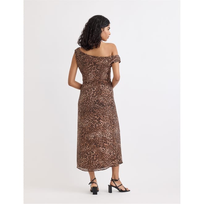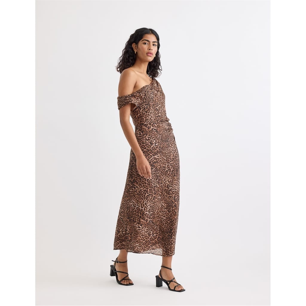 The Skylar dress by Nobody's Child is a striking midi slip dress featuring a one-shoulder neckline. Designed in a slim fit, it showcases a bold leopard pattern with ruffle embellishments, offering a unique and stylish look. -