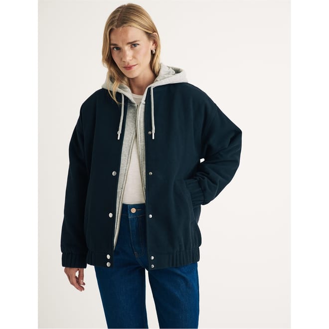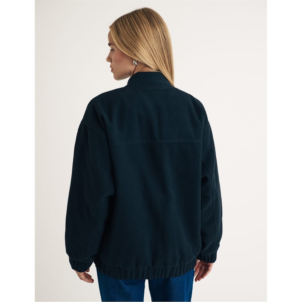 This Nobodys Child bomber jacket features a relaxed fit and a solid pattern. It is designed with a bomber collar and a ribbed hem, offering a classic look. The jacket includes a snap button closure and ribbed cuffs for added style. Practical pockets complete the design, making it a versatile addition to your wardrobe. -