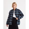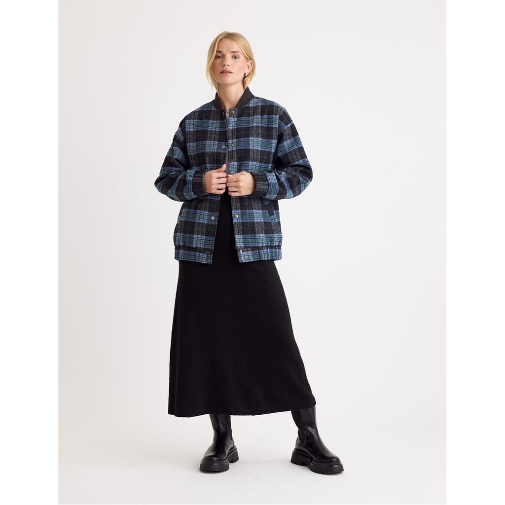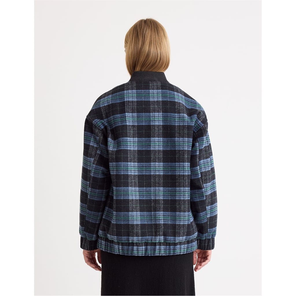 This Nobodys Child bomber jacket features a short length and a relaxed fit, perfect for a casual look. The plaid pattern adds a classic touch, while the bomber collar and ribbed hem enhance its style. It includes a snap button and zipper closure for versatility. Ribbed cuffs and pockets complete the design, offering both comfort and functionality. -