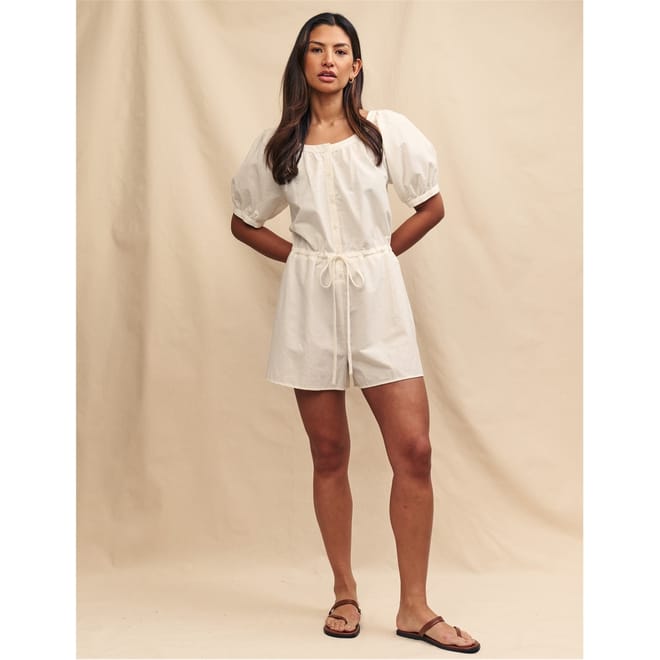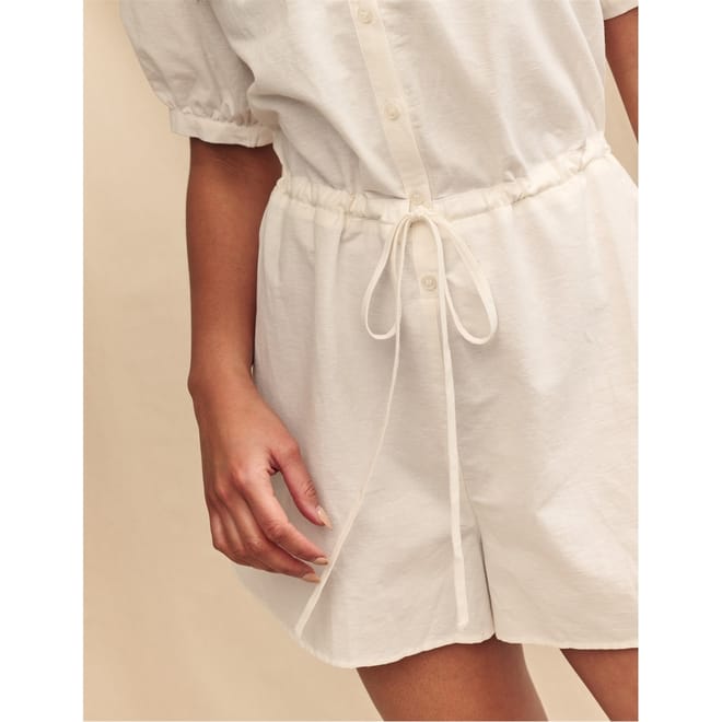 Discover the charm of the Nobody's Child playsuit, featuring a scoop neck and puff short sleeves. This relaxed fit romper is designed with a button closure and tie waist for added style. Practical pockets enhance its functionality, making it a versatile addition to your wardrobe. -