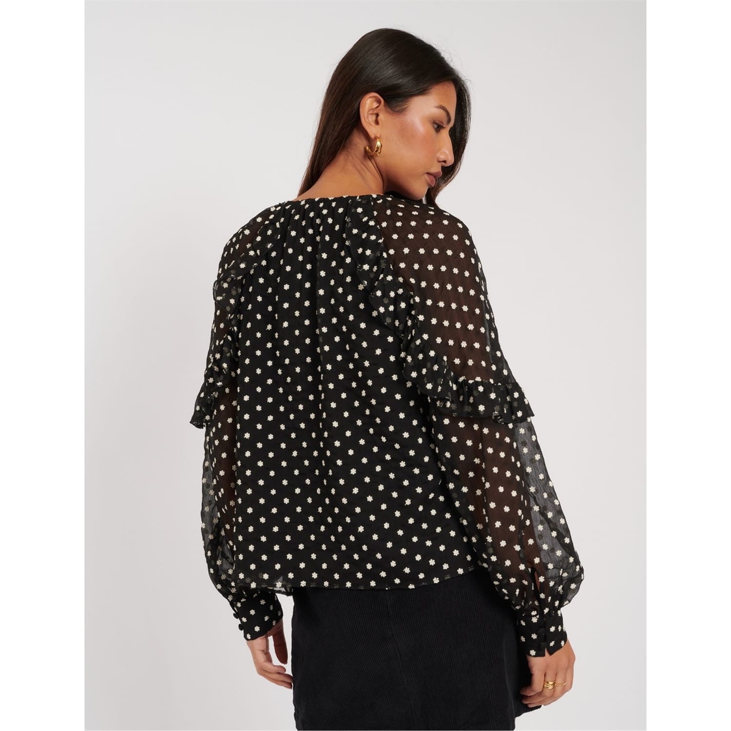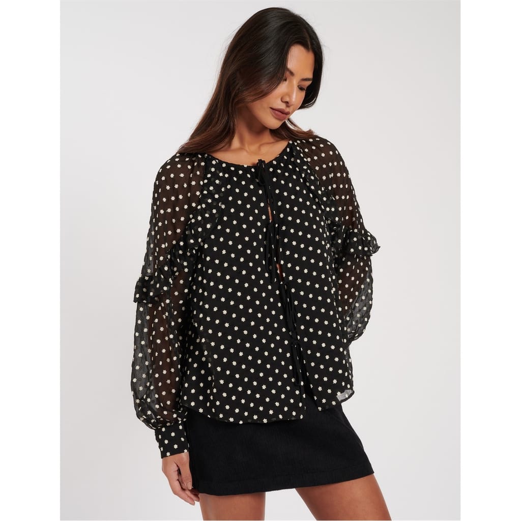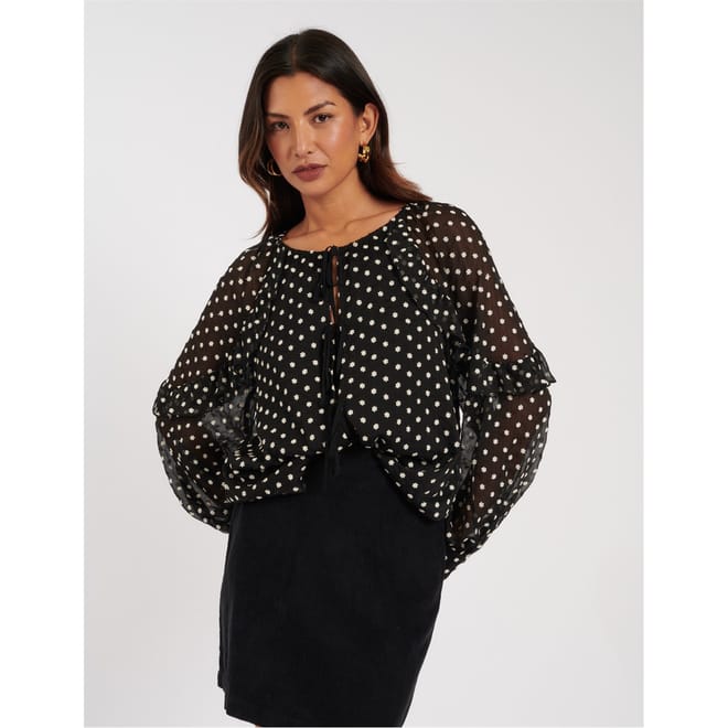 Discover the charm of Nobody's Child tops with this relaxed fit, short sleeve design. Featuring a playful polka dot pattern, this top is adorned with ruffle sleeves and a tie front closure, adding a touch of elegance. Perfect for those who appreciate a blend of style and comfort. -