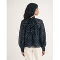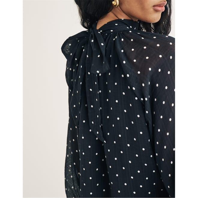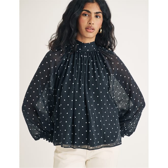 Discover the charm of Nobody's Child tops with this relaxed fit, long sleeve design. Featuring a high neck and playful polka dot pattern, it adds a touch of whimsy to your wardrobe. The balloon sleeves and tie back closure enhance its unique style, making it a standout piece for any occasion. -