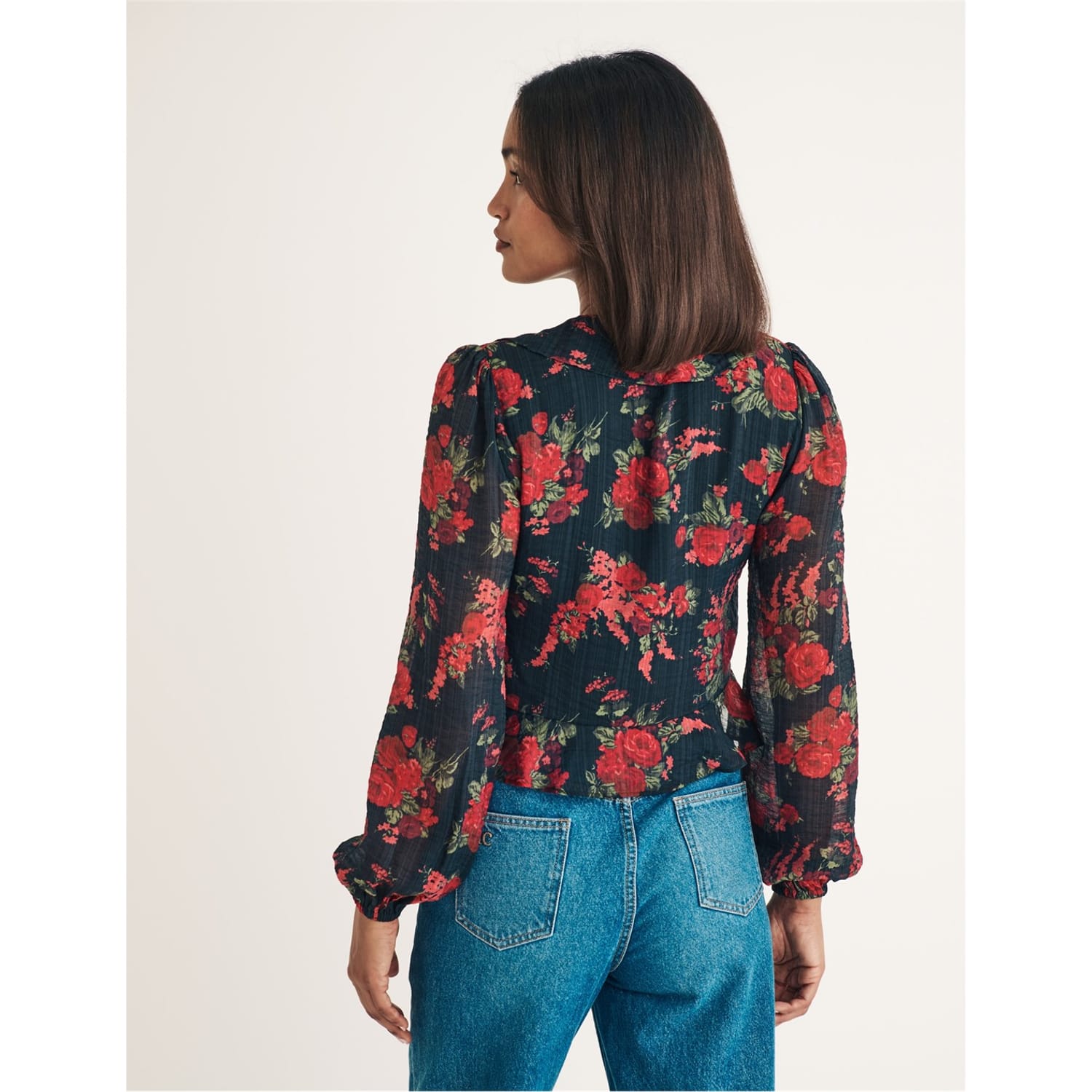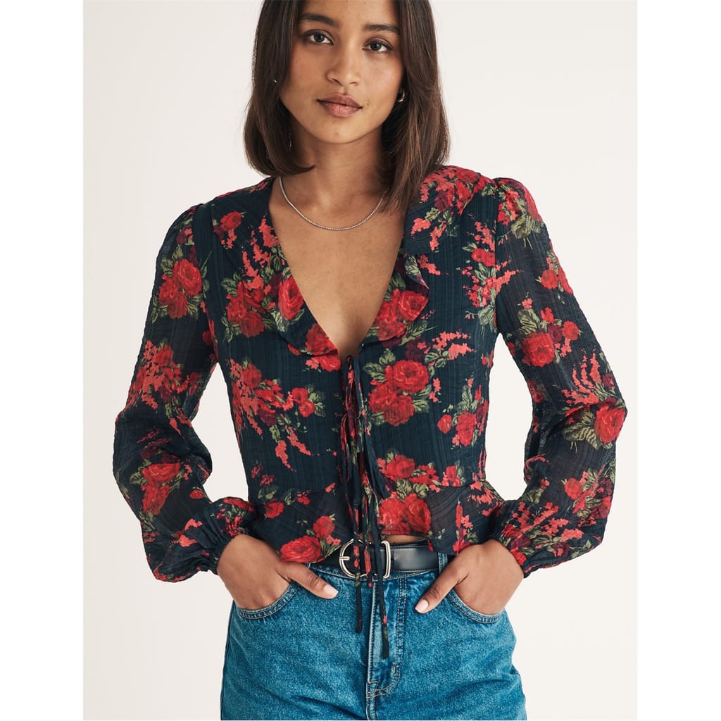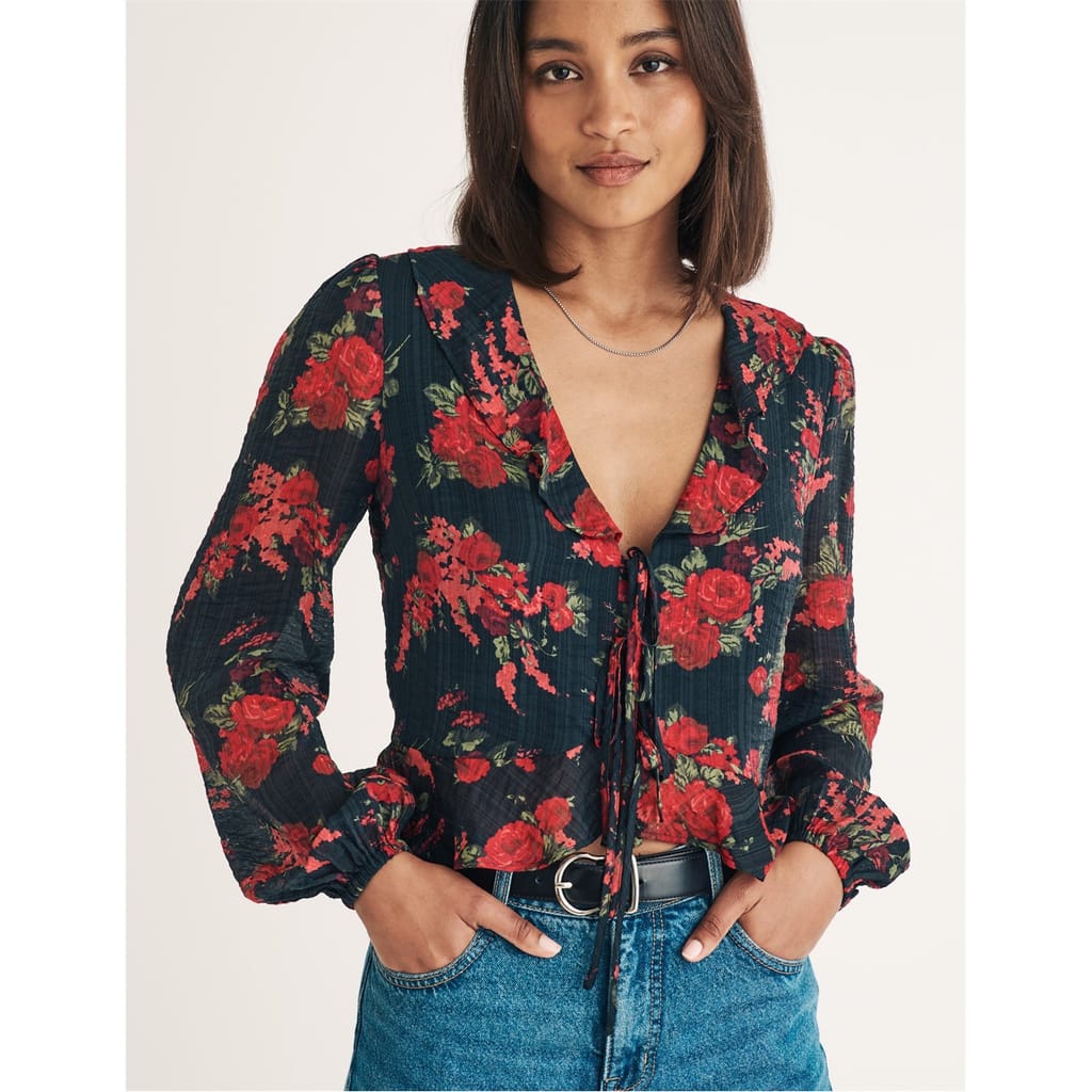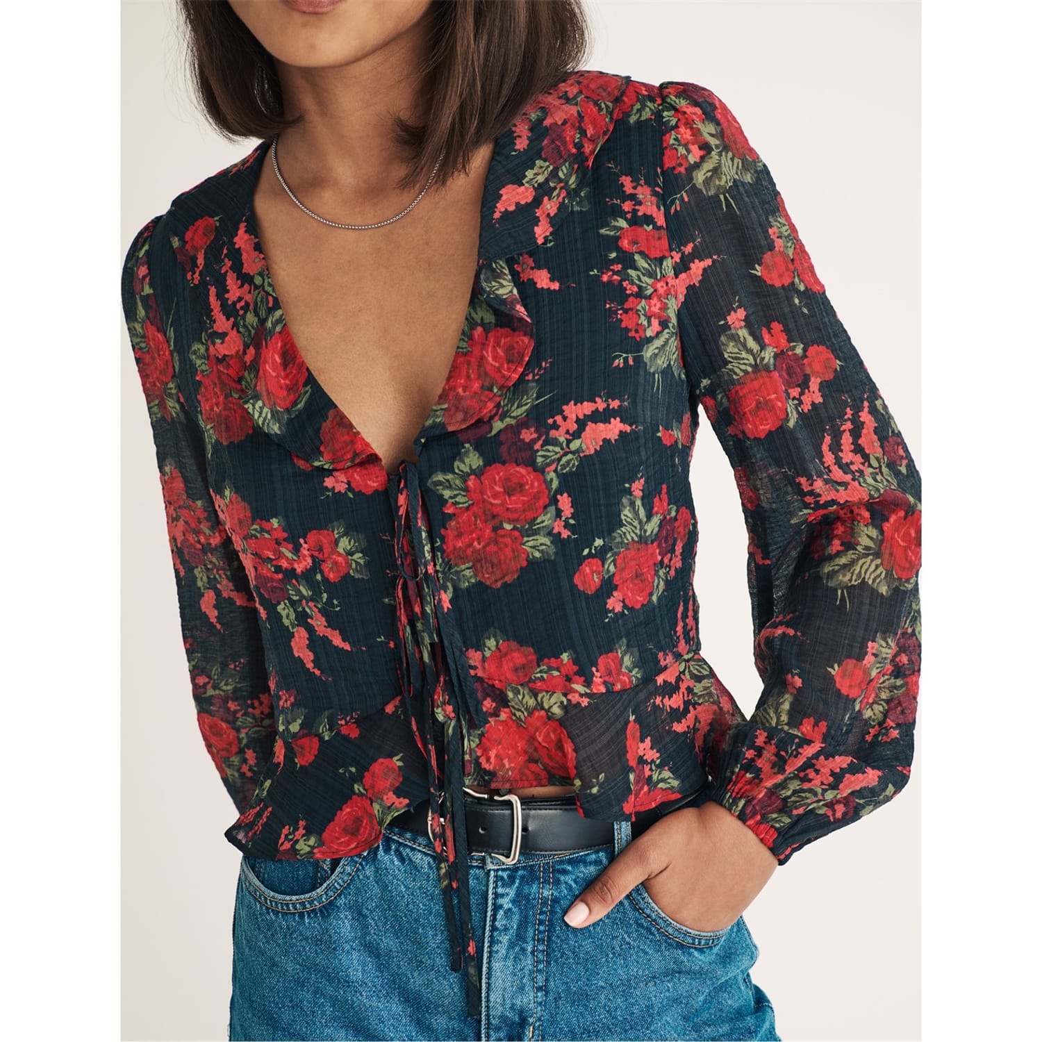 This Nobody's Child top features a relaxed fit with a plunging neck and a tie front closure. The short puff sleeves add a touch of elegance, while the floral pattern and ruffle embellishments enhance its charm. Perfect for those seeking a stylish and comfortable addition to their wardrobe. -