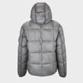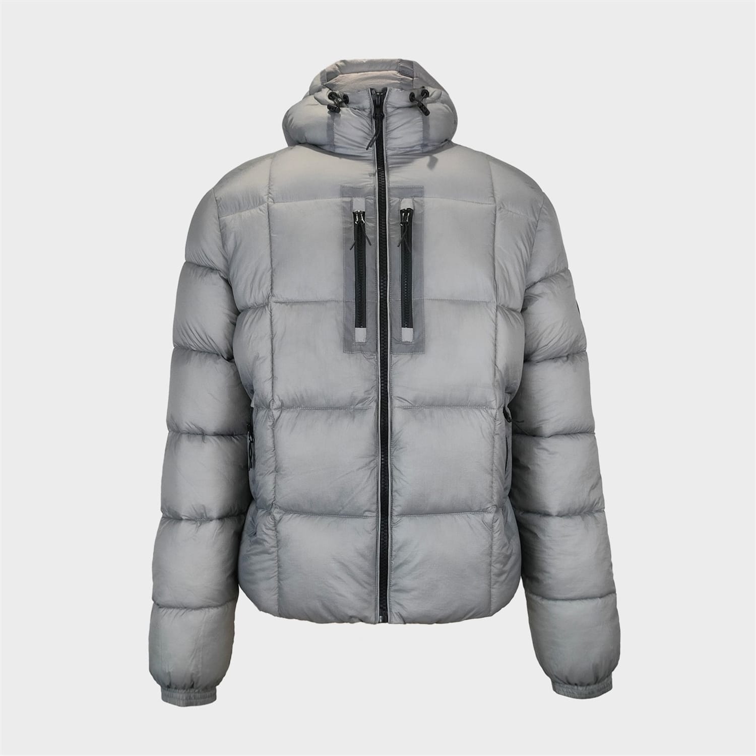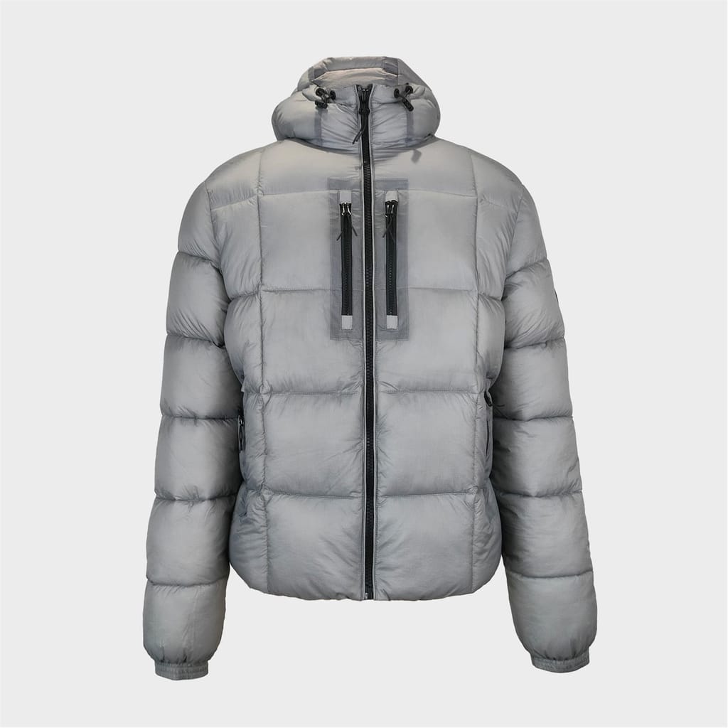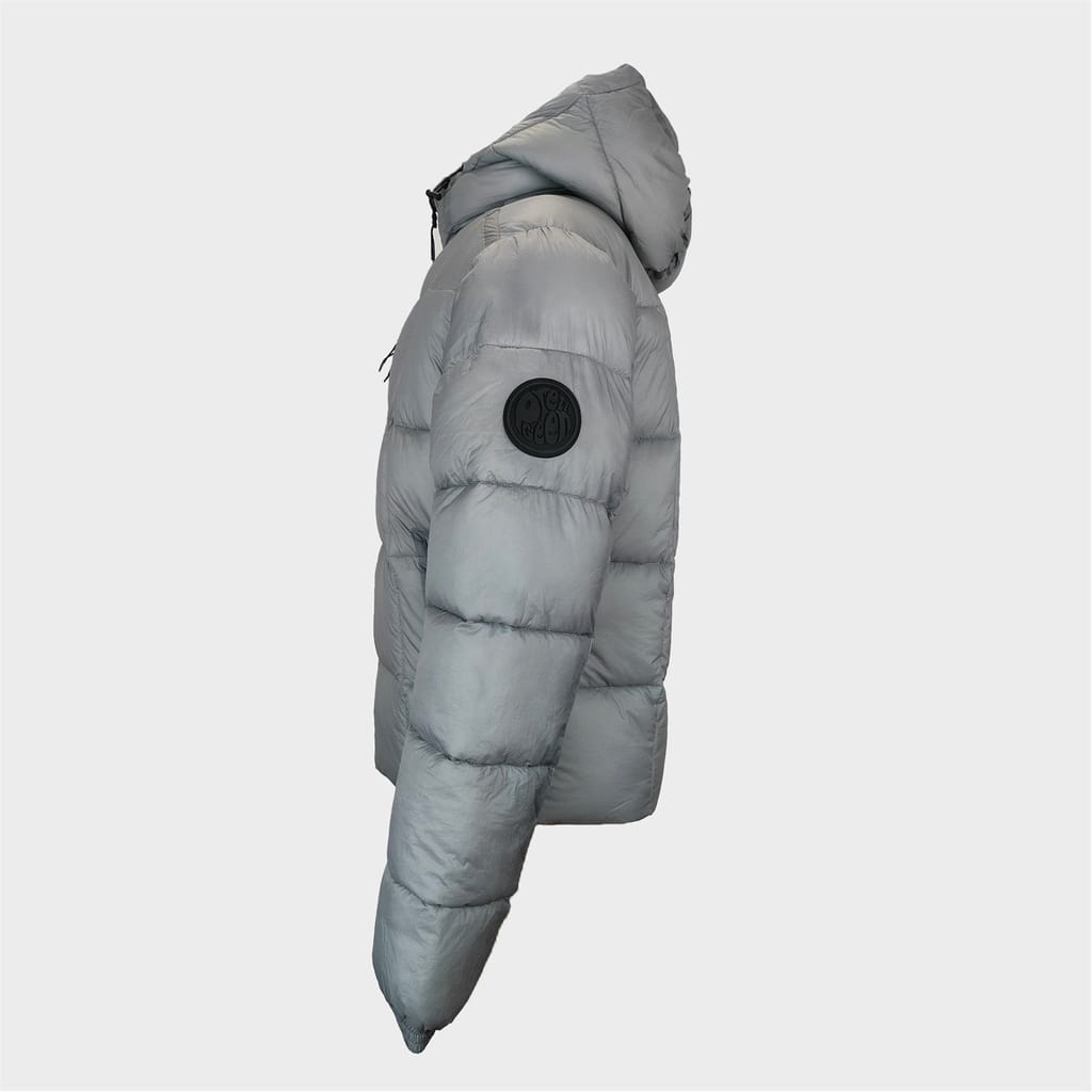 The Pretty Green puffer jacket features a hooded design and a zipper closure, offering a regular fit. This short jacket is crafted with a solid pattern and includes ribbed cuffs for added comfort. A distinctive rubber badge embellishment adds a unique touch to this stylish piece. -