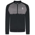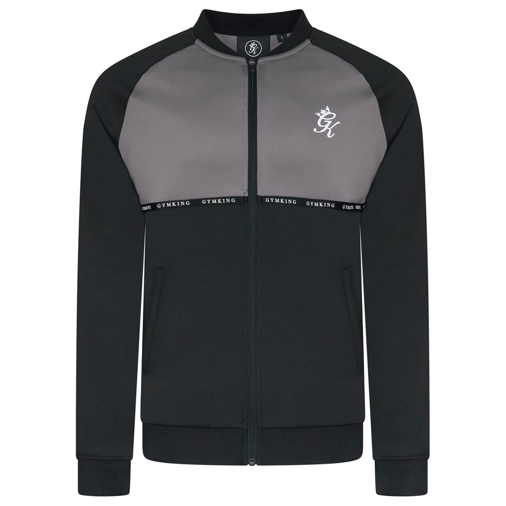 The Gym King track jacket from the activewear collection features a full zipper closure and a regular fit. It showcases a stylish color block pattern with raglan sleeves and ribbed cuffs and hem. The jacket is embellished with a logo and lettering, adding a distinctive touch to its design. -