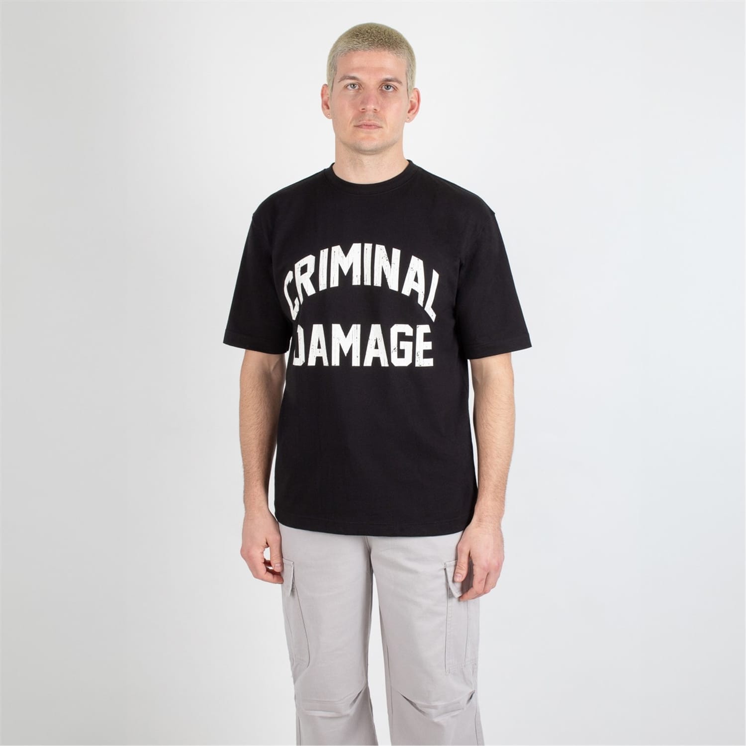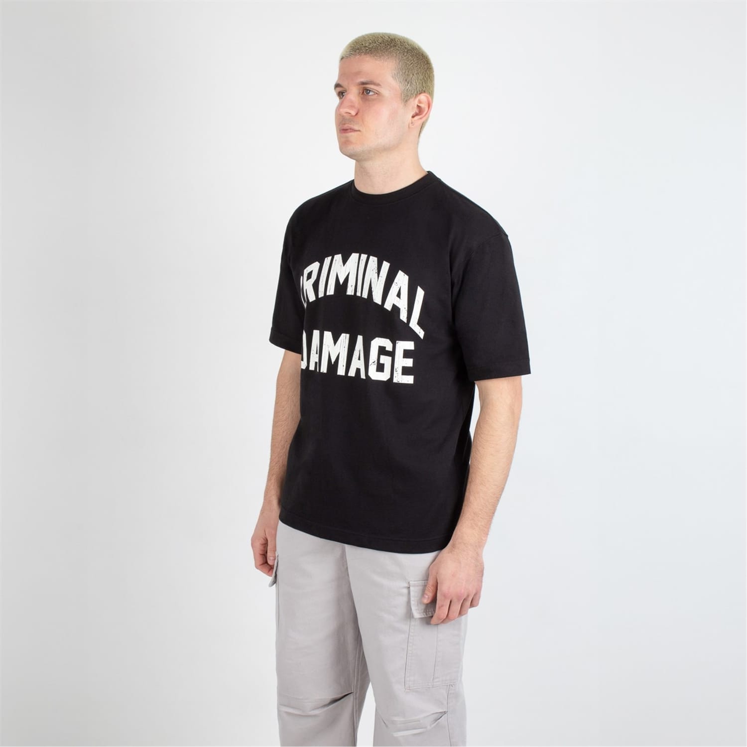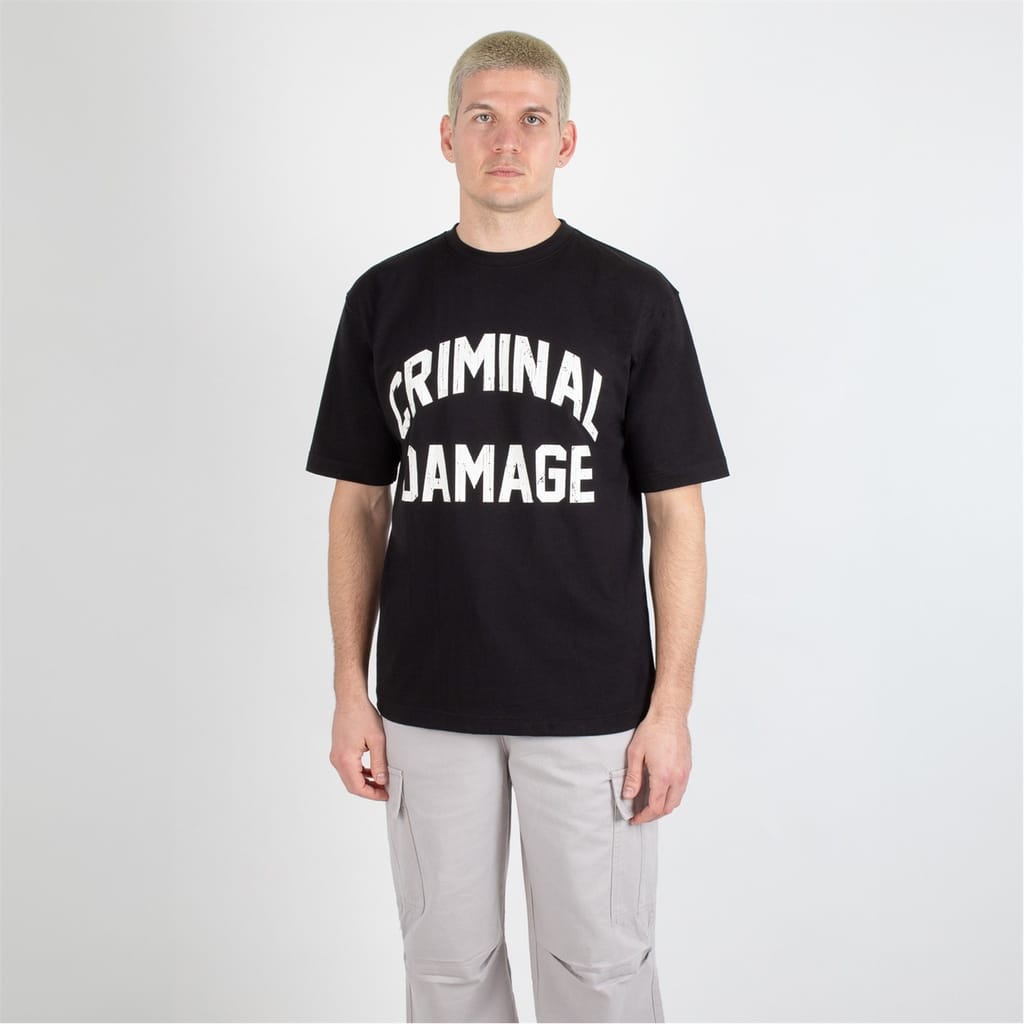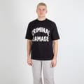 This Criminal Damage top is perfect for casual wear, featuring an oversized fit and short sleeves. The crew neck design is complemented by a striking graphic print, including a logo and lettering. Ideal for those who appreciate bold style, this top is a standout piece in any wardrobe. -