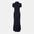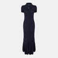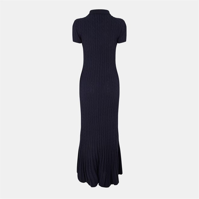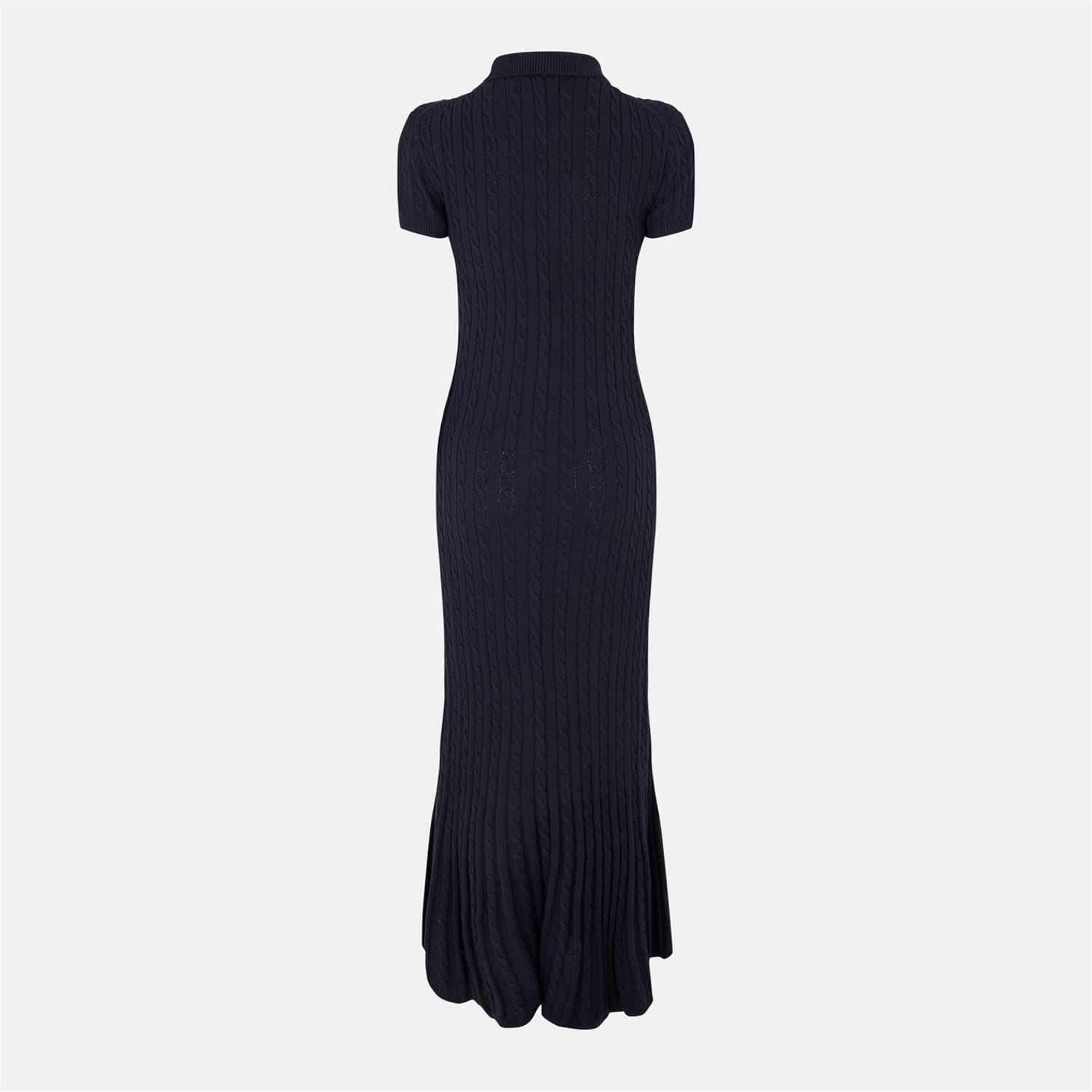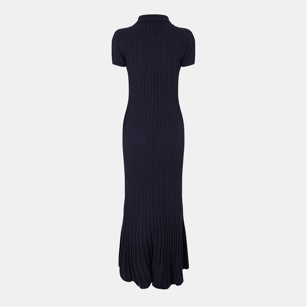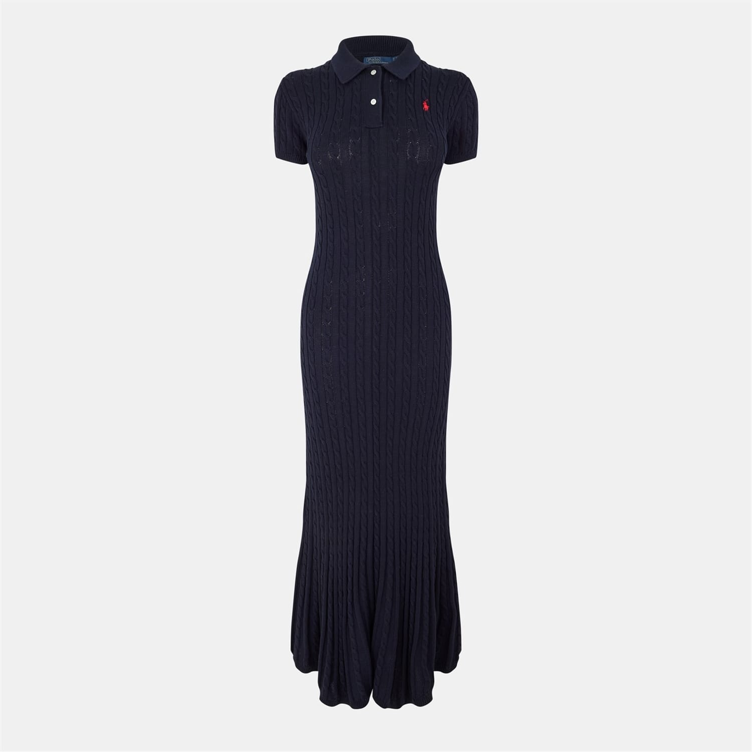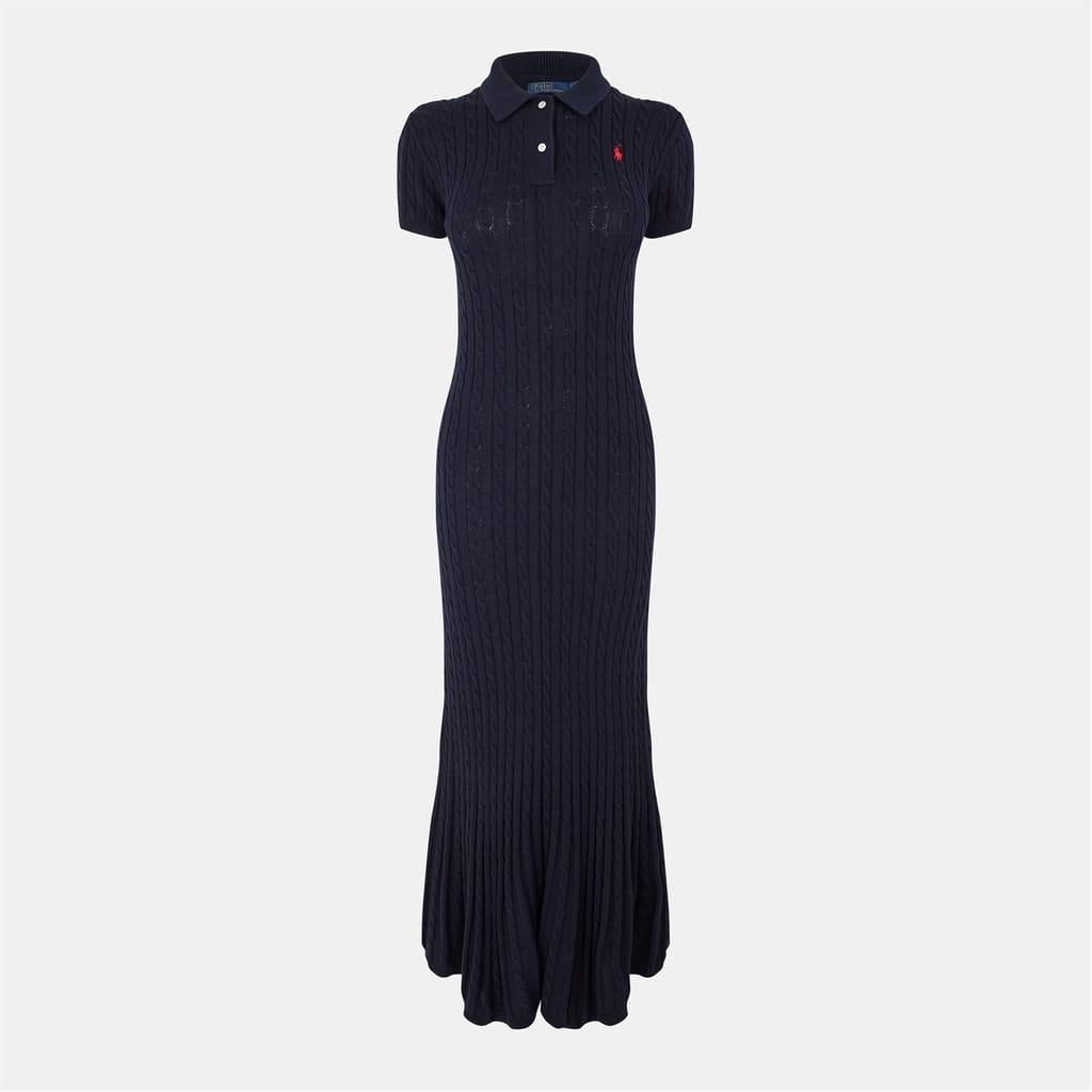This Polo Ralph Lauren shirt dress features a maxi length with a collared neck and polo collar, offering a classic look. The short sleeves and button closure enhance its slim fit, while the fishtail hemline adds a unique touch. The cable knit pattern and logo embellishment complete the design, making it a stylish choice for any occasion. -