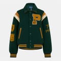 This Polo Ralph Lauren bomber jacket features a short length and a regular fit, perfect for a stylish look. It comes with a shirt collar and snap button closure, complemented by ribbed cuffs and hem. The jacket is adorned with pockets, logo, lettered branding, and patches, showcasing a colour block pattern with lettering graphics for a distinctive appearance. -