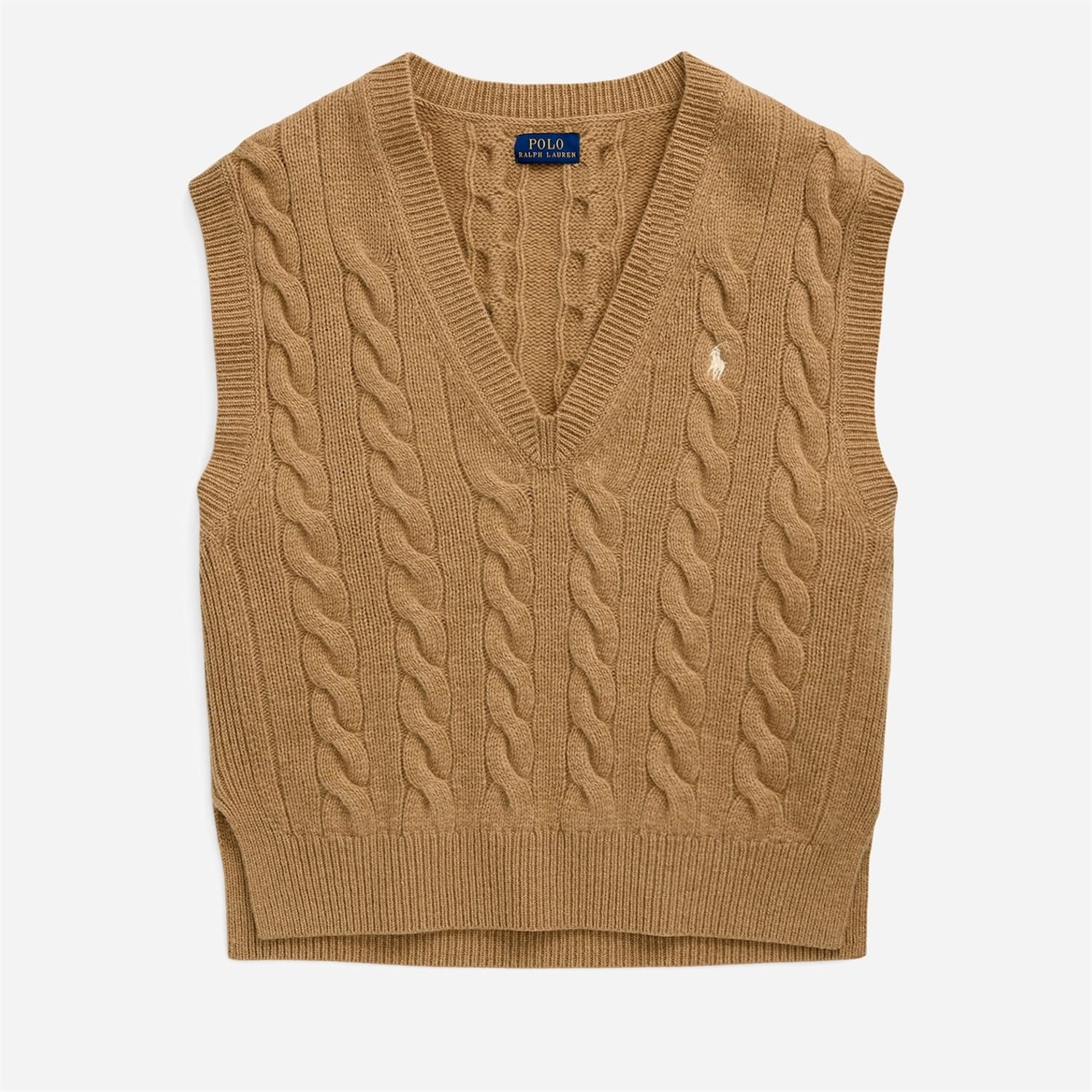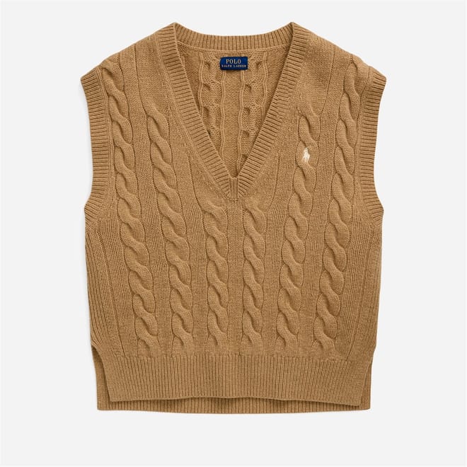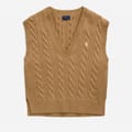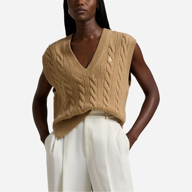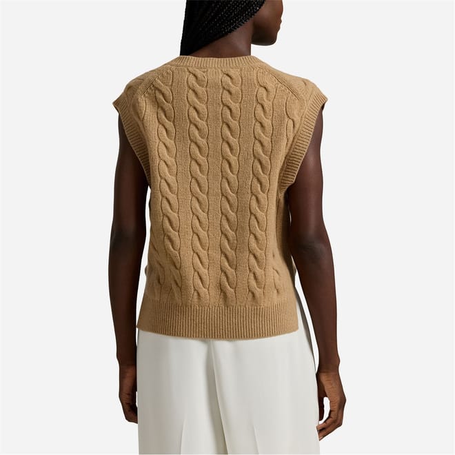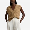 This Polo Ralph Lauren top features a classic cable knit pattern, offering a timeless appeal. The sleeveless design and V-neckline provide a stylish touch, while the regular fit ensures comfort. Crafted with a knit texture, this top is perfect for adding a sophisticated element to your wardrobe. -