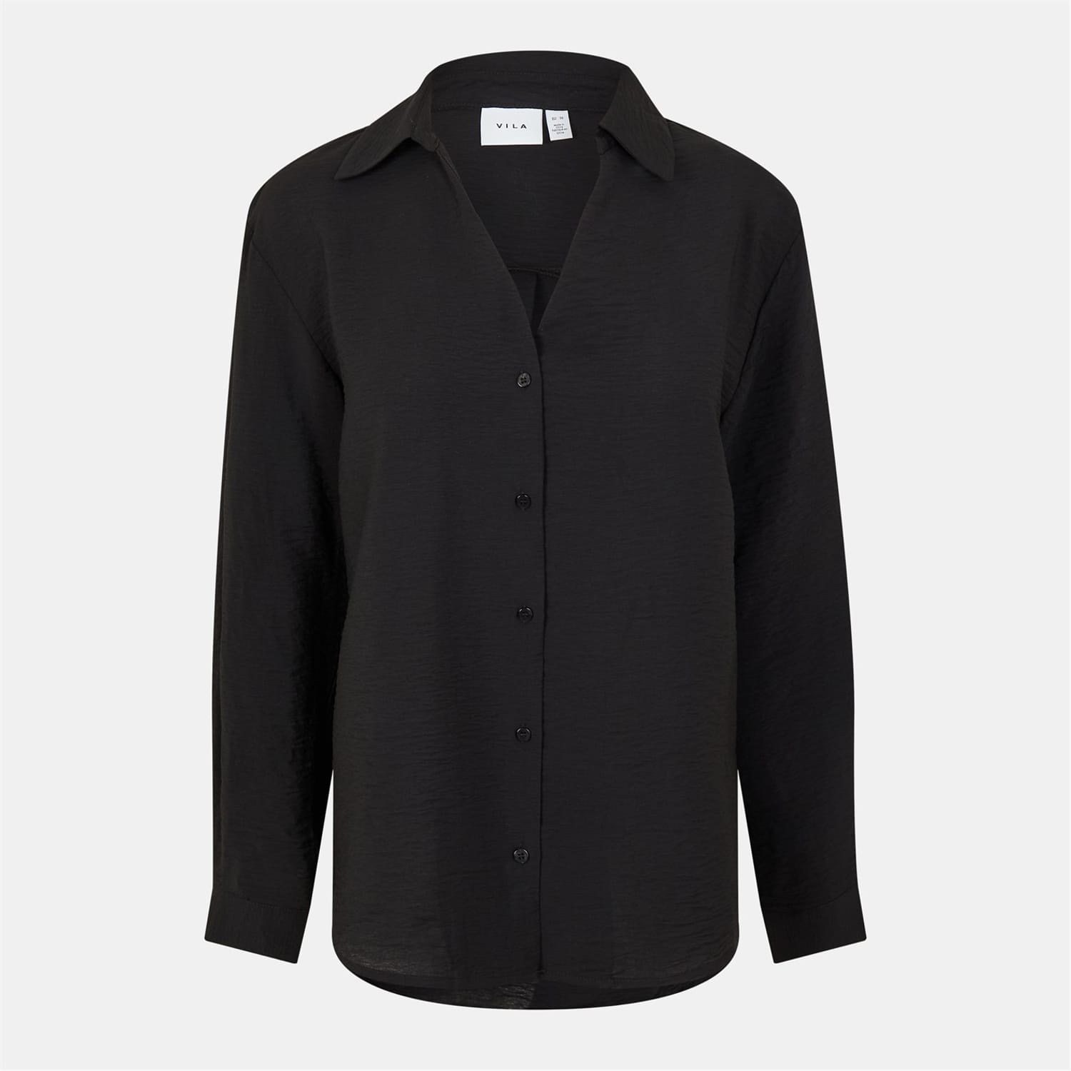 This Vila top features a classic shirt collar and a button closure, offering a timeless appeal. Designed with long sleeves and a regular fit, it provides comfort and style for any occasion. The solid pattern adds a touch of elegance, making it a versatile addition to your wardrobe. -
