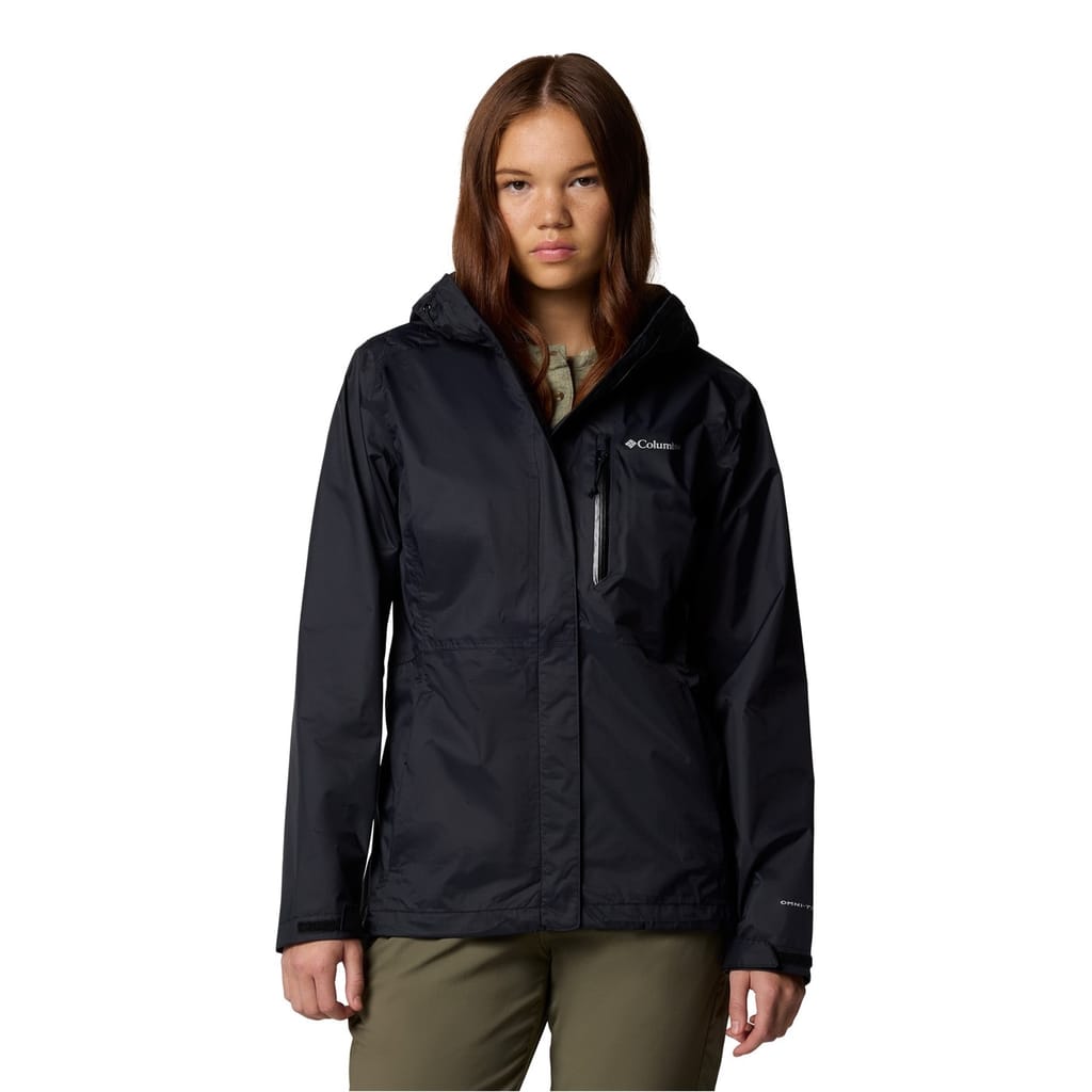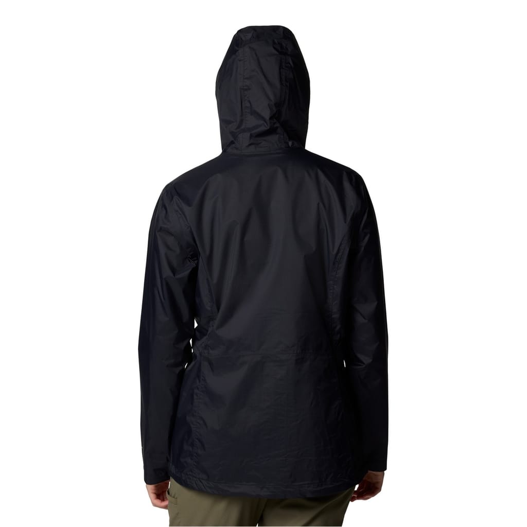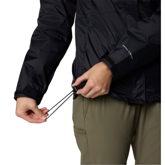 Columbia's water-repellent jacket features a hooded neck and a solid pattern. Designed with a zipper closure, it offers a regular fit for comfort and practicality. -