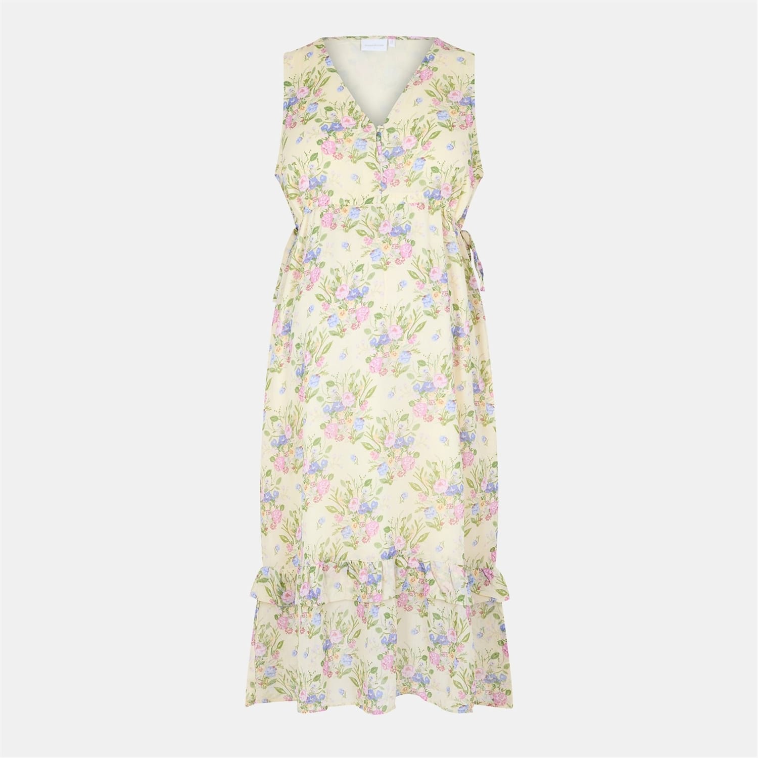 This Mamalicious mini dress features a charming floral pattern and a flattering A-line style. The V-neck design is complemented by a tie closure, adding a touch of elegance. The dress is adorned with ruffle embellishments, including a ruffle hem, creating a playful and feminine look. -