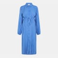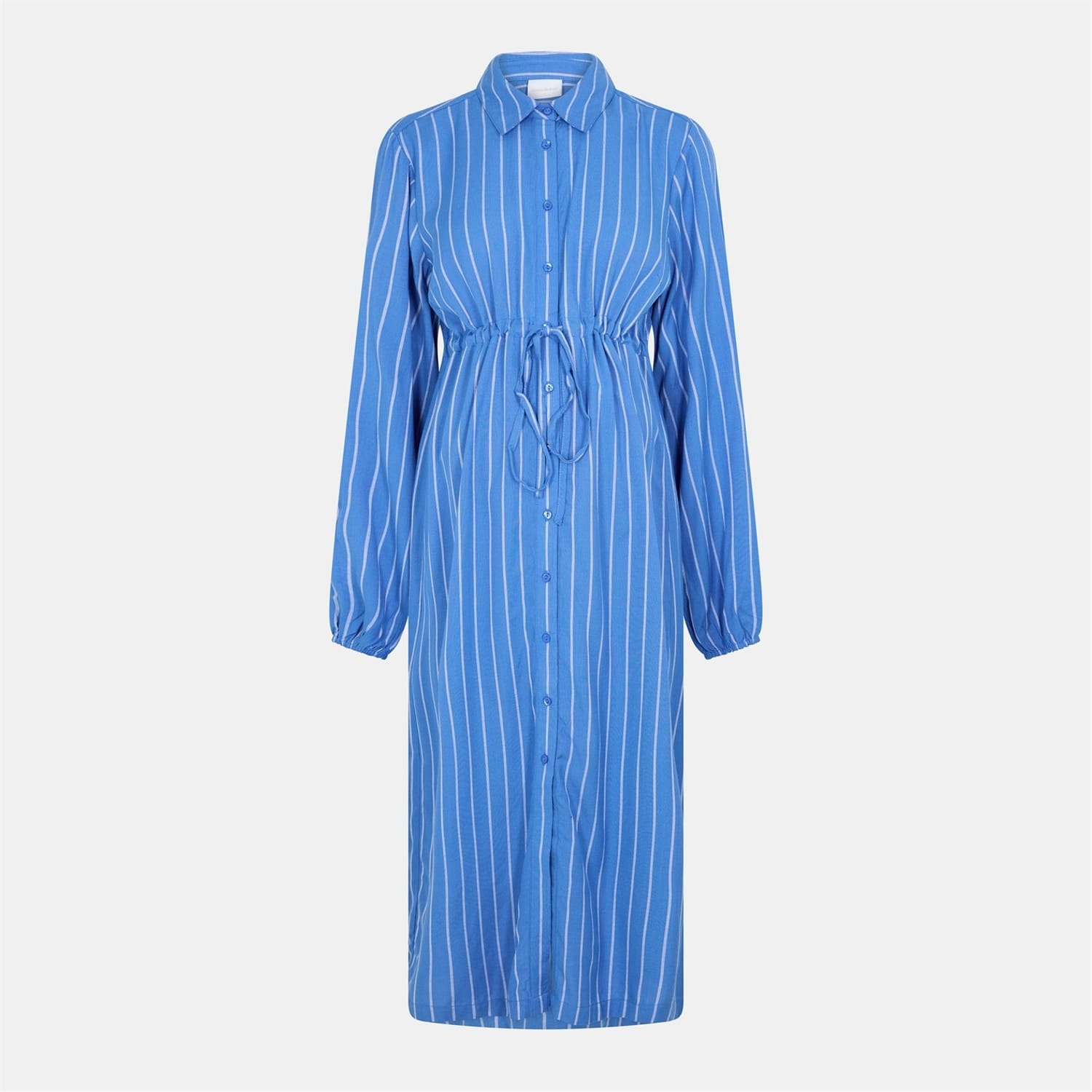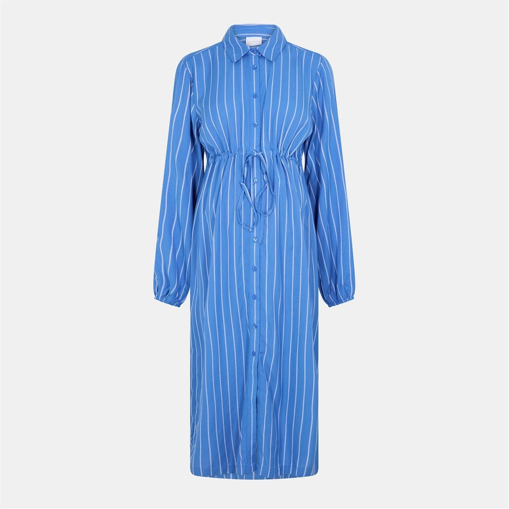 This Mamalicious shirtdress features a classic collared neck and a shirt collar, offering a sophisticated touch. The midi length and straight hem create a balanced silhouette, while the button closure adds practicality. Adorned with vertical stripes and pockets, this dress combines style and functionality effortlessly. -