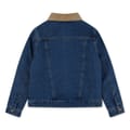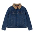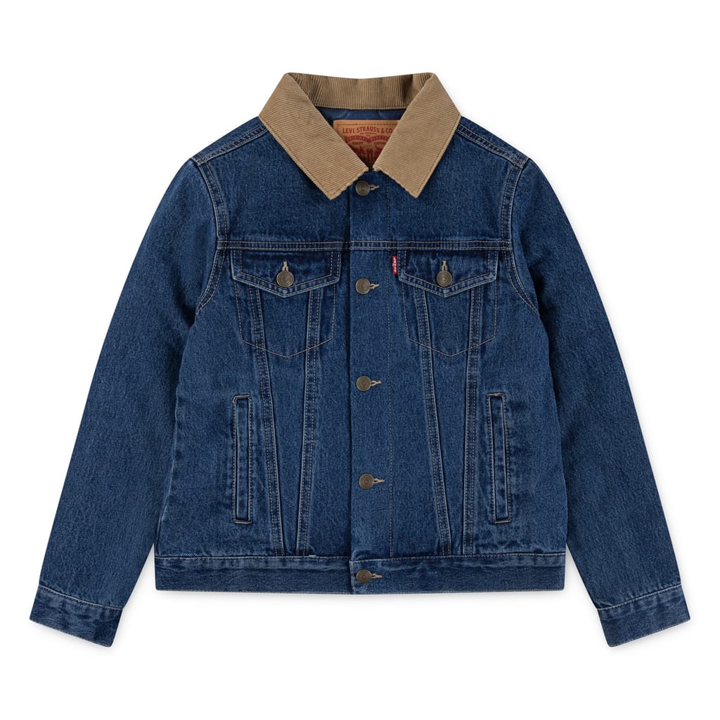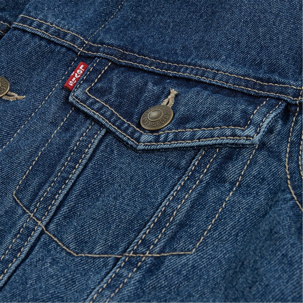 This Levi's denim jacket features a classic shirt collar and a button closure, offering a timeless appeal. The regular fit and short length provide a comfortable wear, while the lined interior ensures added warmth. Embellished with a logo and practical chest pockets, this solid pattern jacket is completed with cuff sleeves and a straight hem for a polished finish. -
